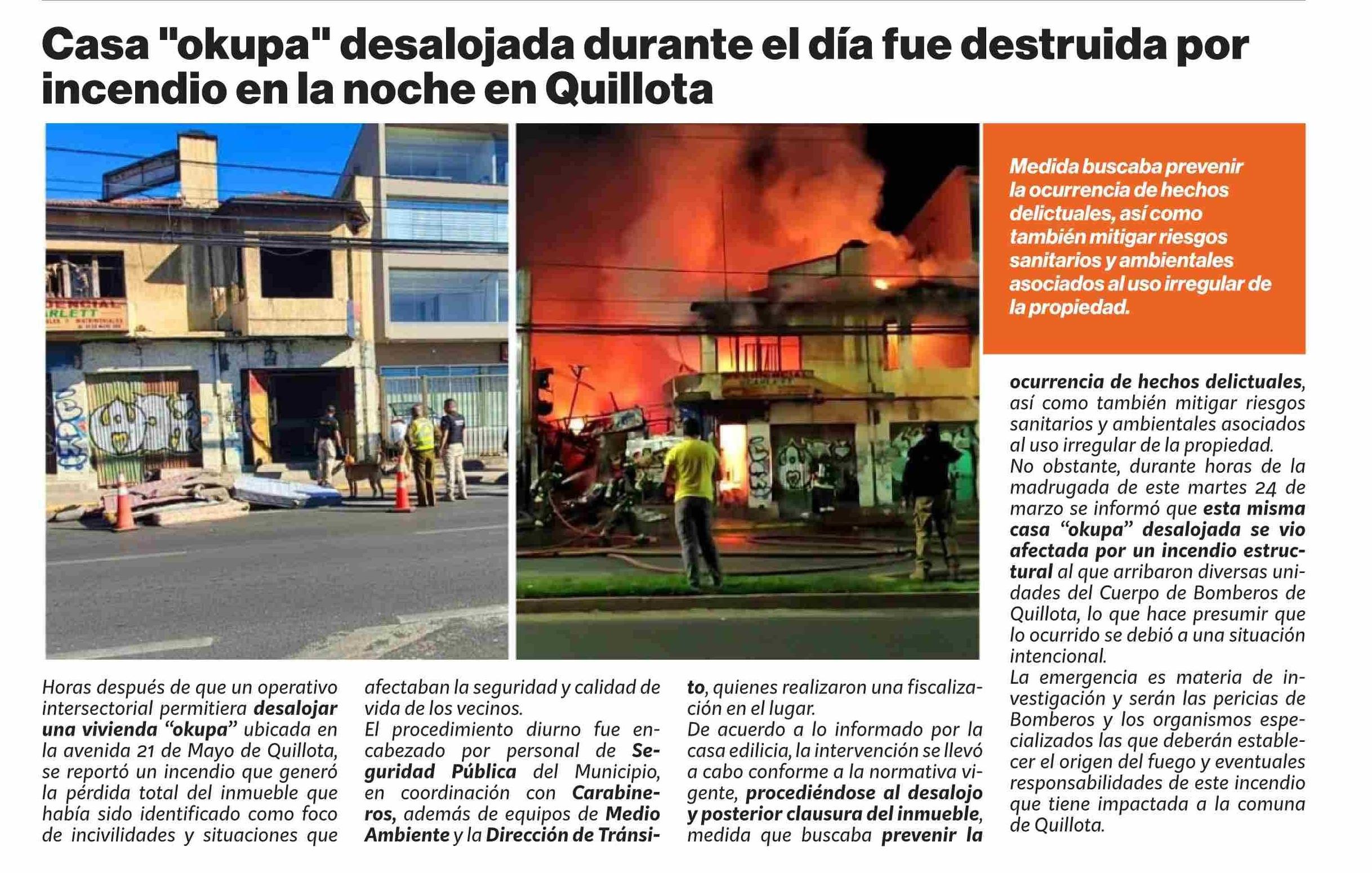 Título: Casa "okupa" desalojada durante el día fue destruida por incendio en la noche en Quillota