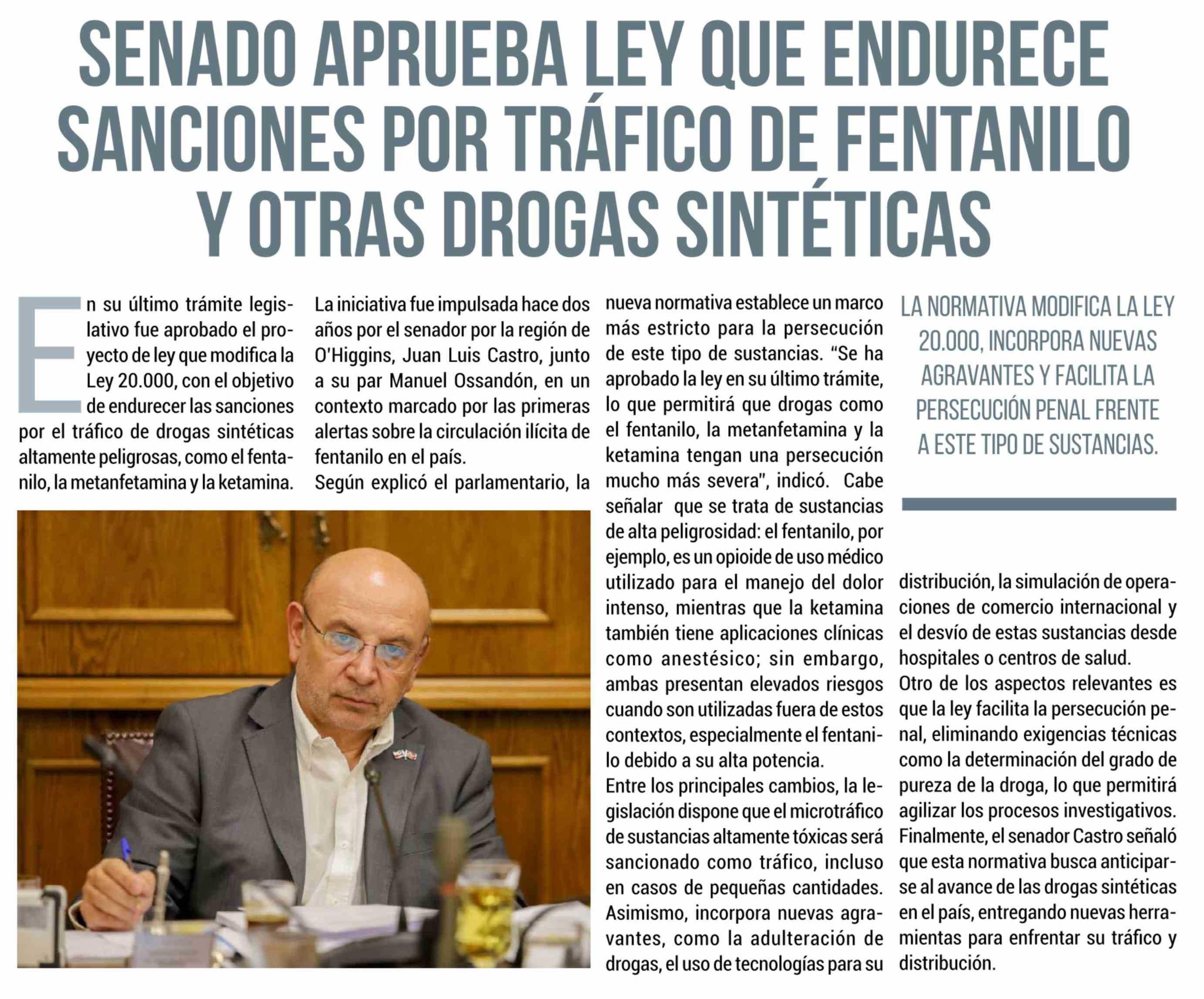SENADO APRUEBA LEY QUE ENDURECE SANCIONES POR TRÁFICO DE FENTANILO Y OTRAS DROGAS SINTÉTICAS 09-04-2026 El Rancagüino |