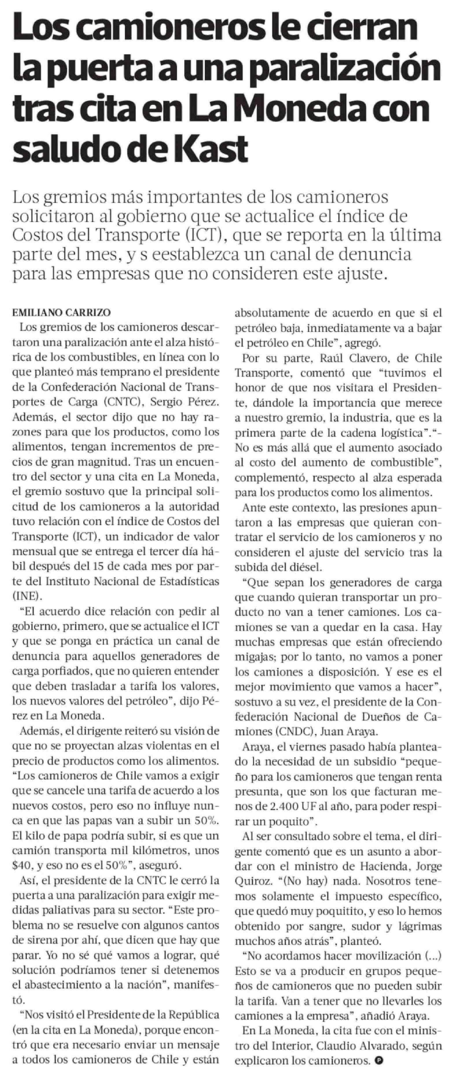 | Título: | Los camioneros le cierran la puerta a una paralización tras cita en La Moneda con saludo de Kast |