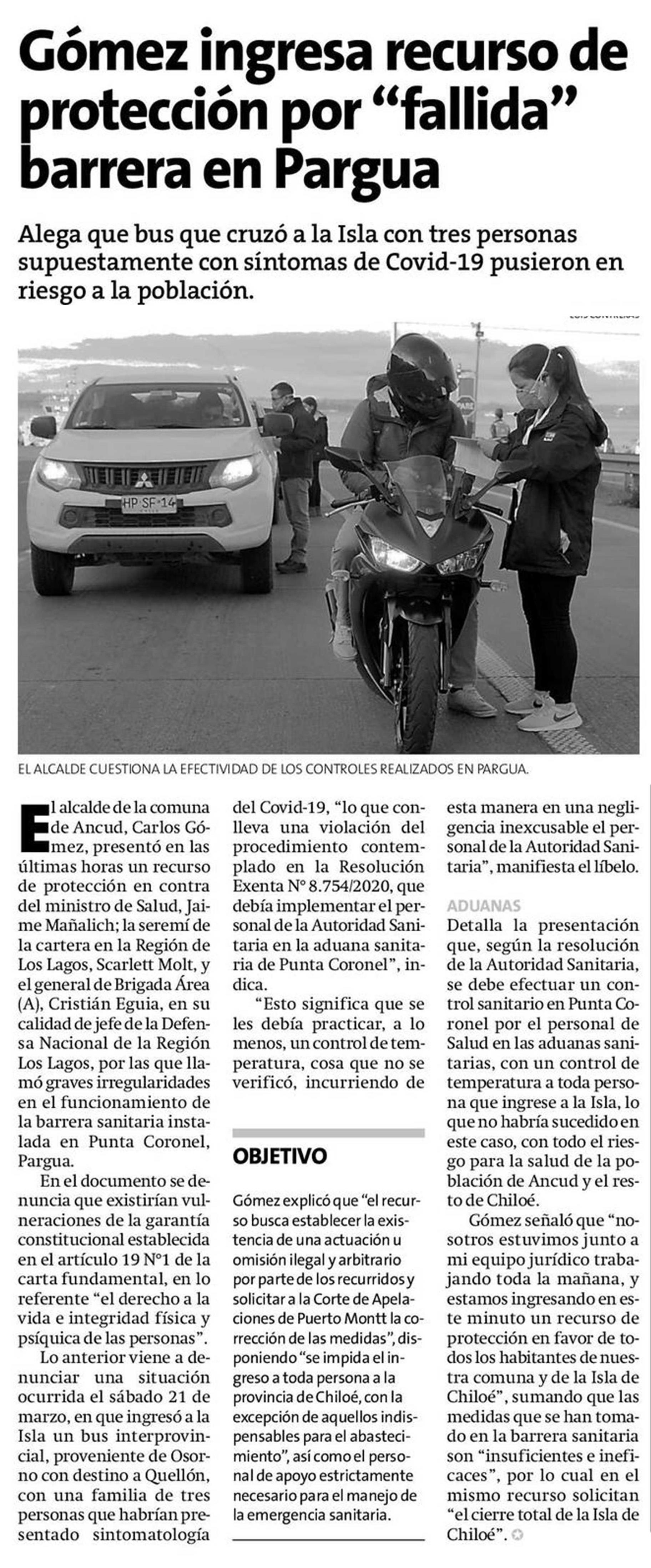 Gómez ingresa recurso de protección por “fallida” barrera en Pargua 24-03-2020 La Estrella de Chiloé |