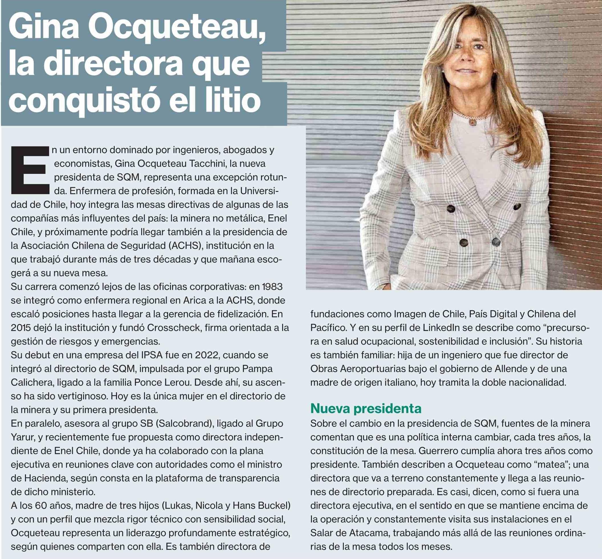 Gina Ocqueteau, la directora que conquistó el litio 28-05-2025 La Segunda |