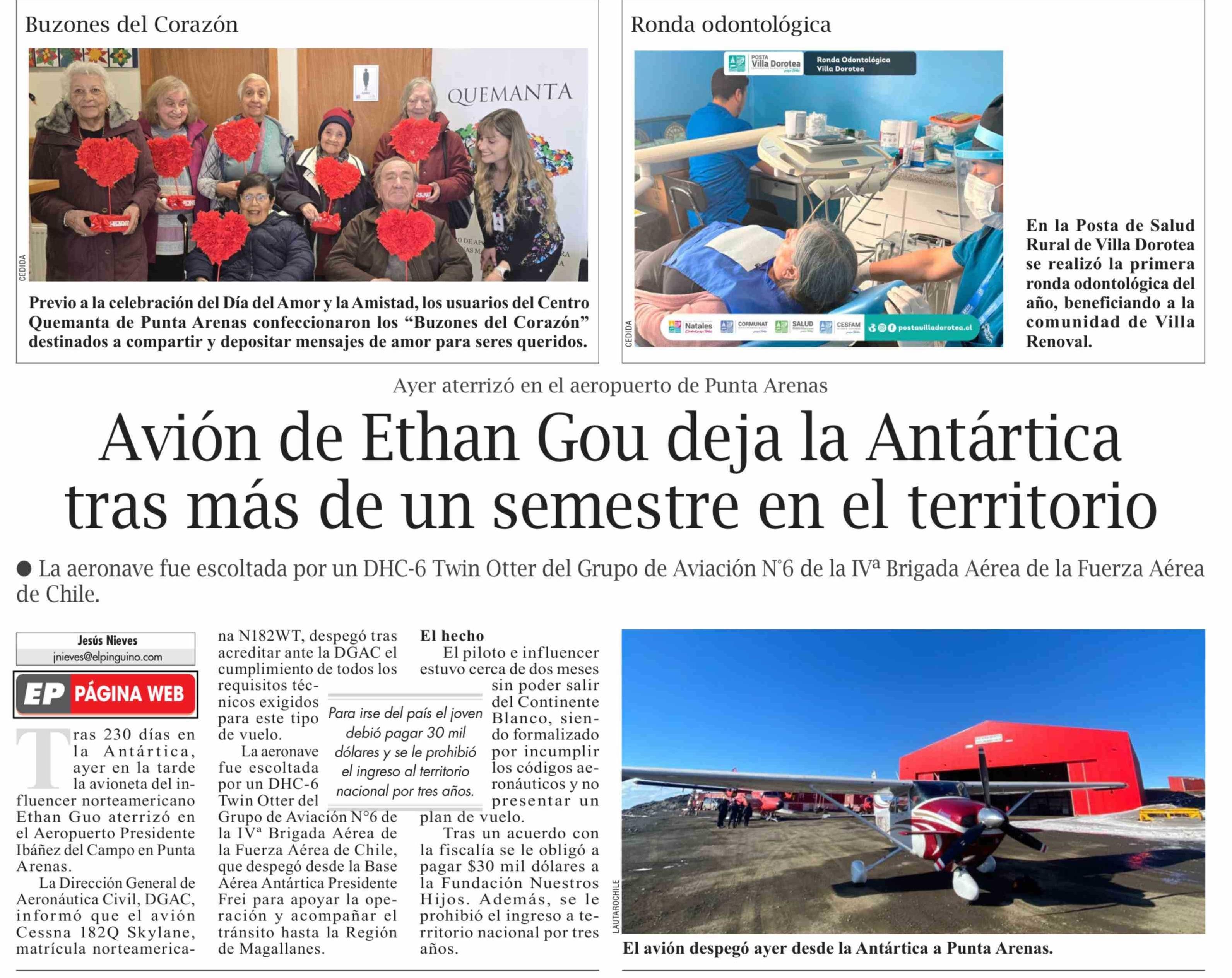Título: Avión de Ethan Gou deja la Antártica tras más de un semestre en el territorio