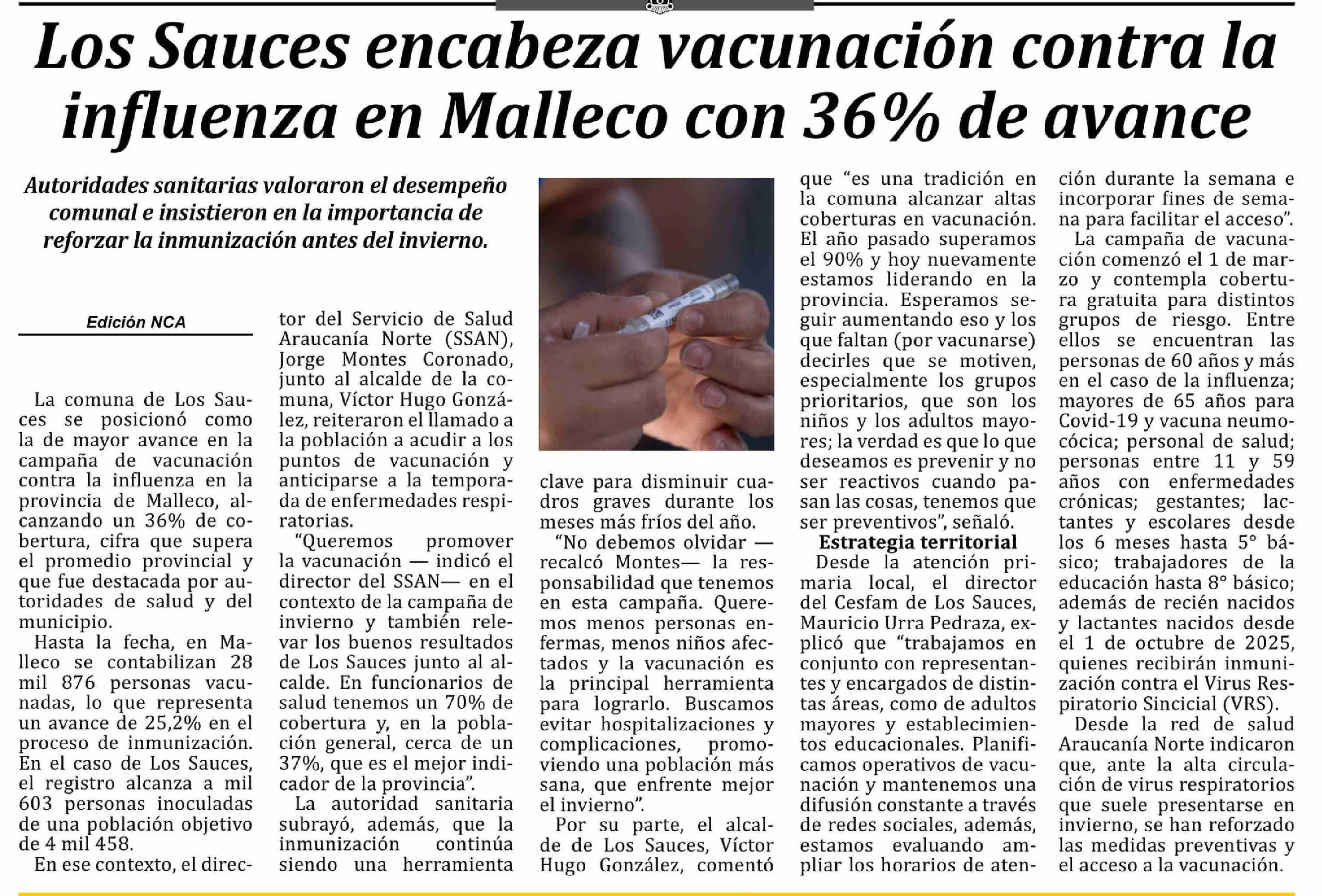 | Título: | Los Sauces encabeza vacunación contra la influenza en Malleco con 36% de avance |