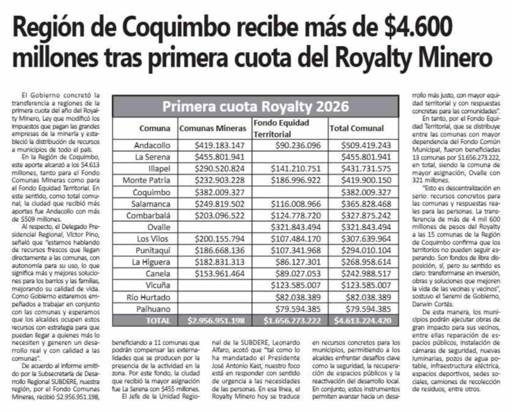 Región de Coquimbo recibe más de $4.600 millones tras primera cuota del Royalty Minero 17-04-2026 Semanario Tiempo |