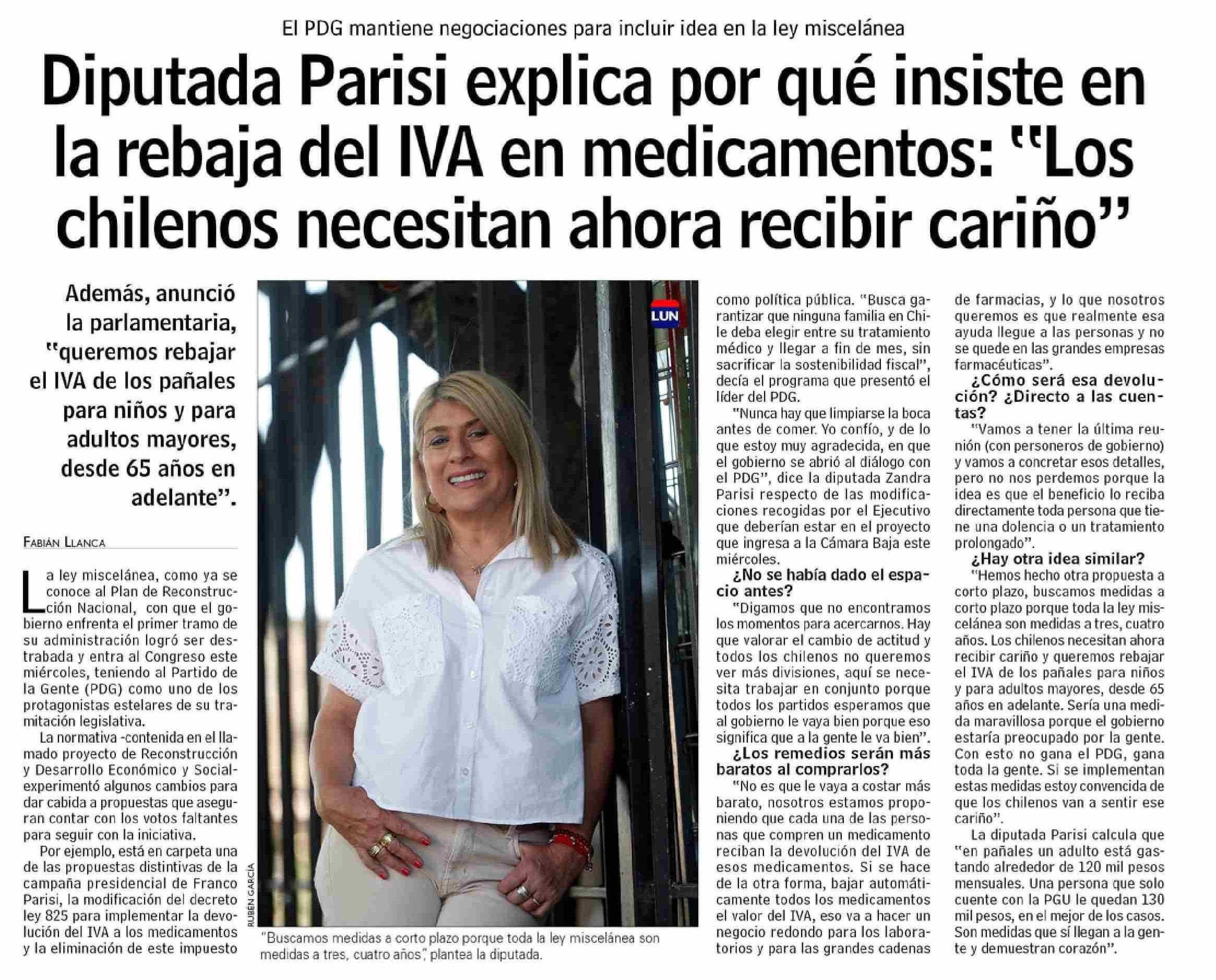 | Título: | Diputada Parisi explica por qué insiste en la rebaja del IVA en medicamentos: “Los chilenos necesitan ahora recibir cariño” |