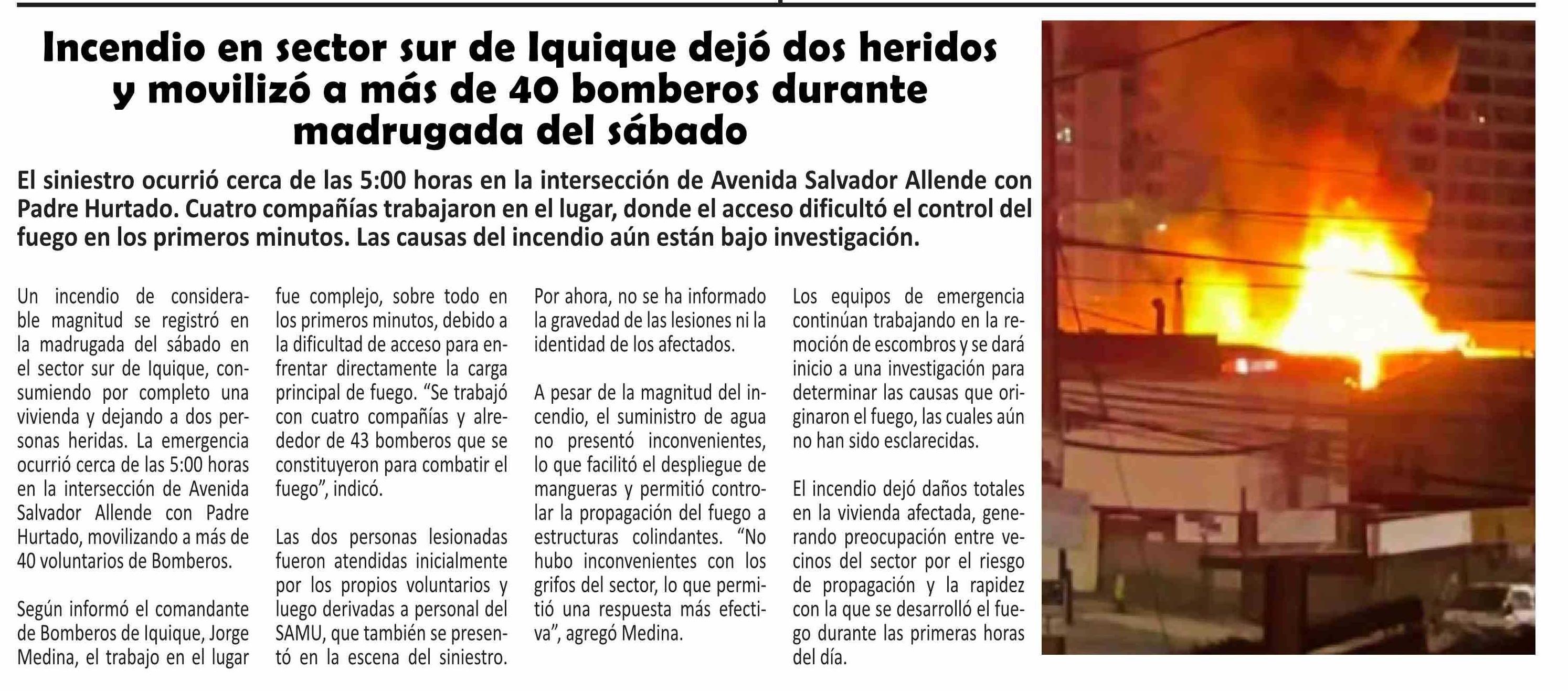 | Título: | Incendio en sector sur de Iquique dejó dos heridos y movilizó a más de 40 bomberos durante madrugada del sábado |