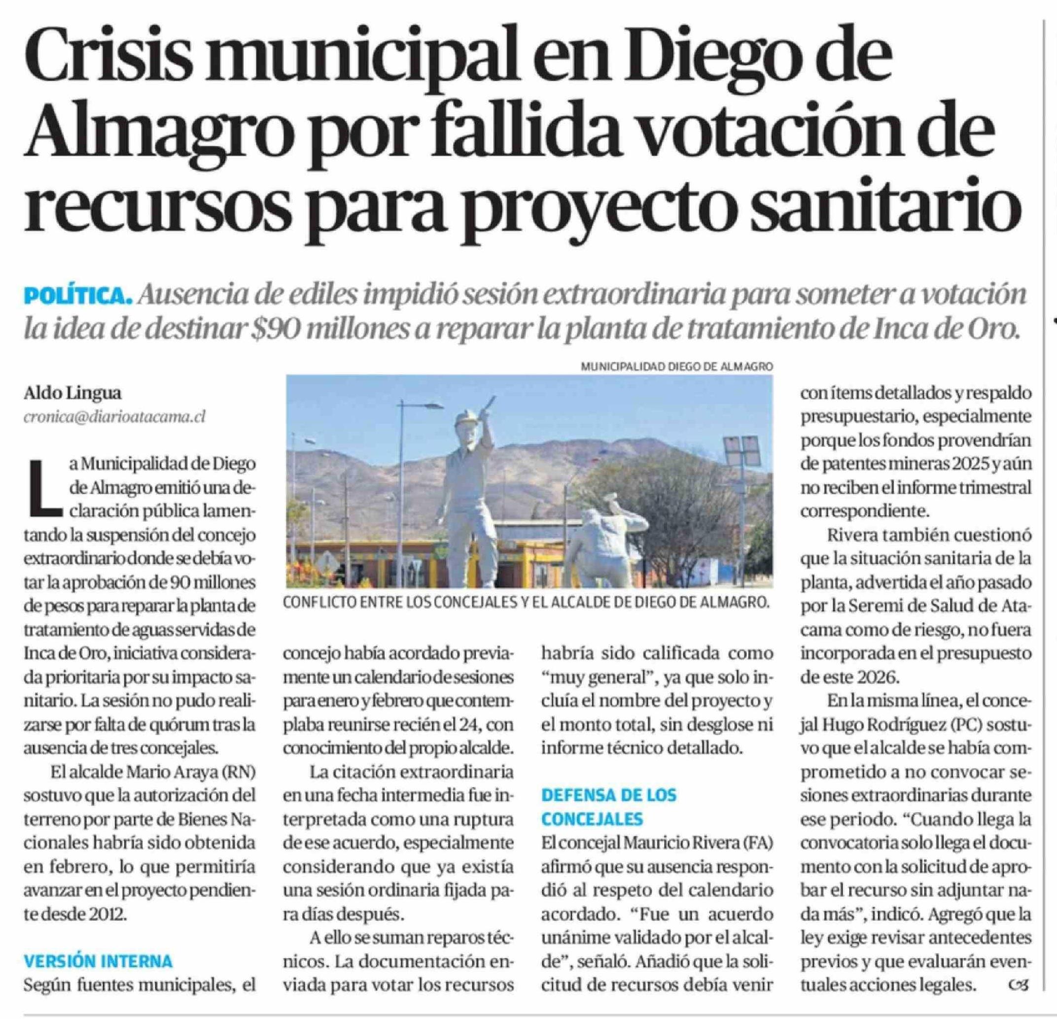 Título: Crisis municipal en Diego de Almagro por fallida votación de recursos para proyecto sanitario
