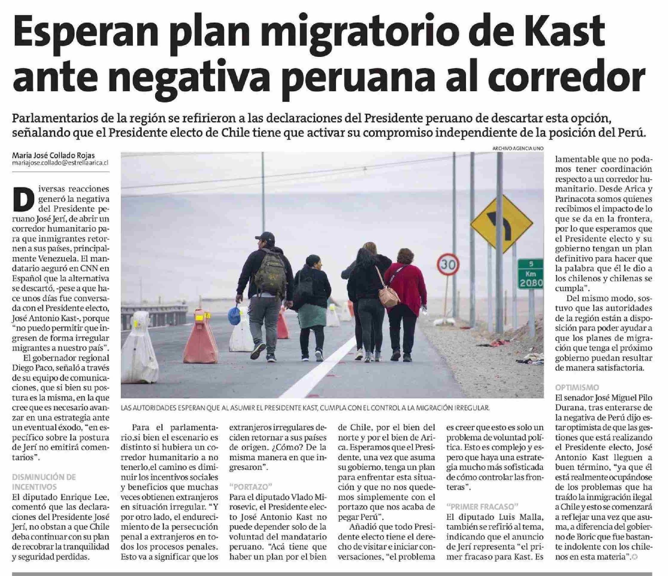 Título: Esperan plan migratorio de Kast ante negativa peruana al corredor