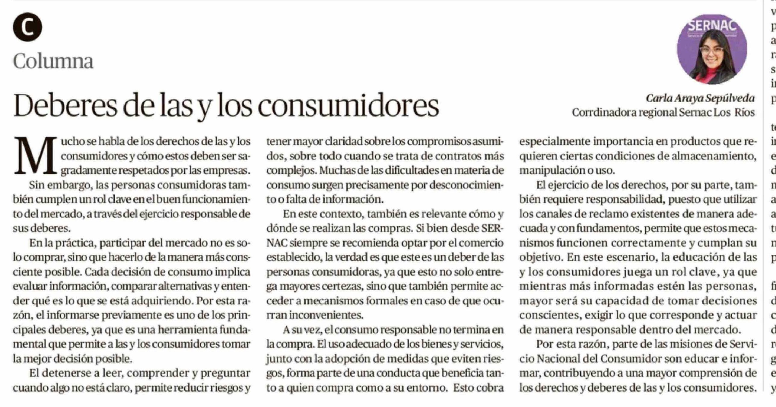 Columnas de Opinión: Deberes de las y los consumidores 12-04-2026 Diario Austral Región de Los Ríos |