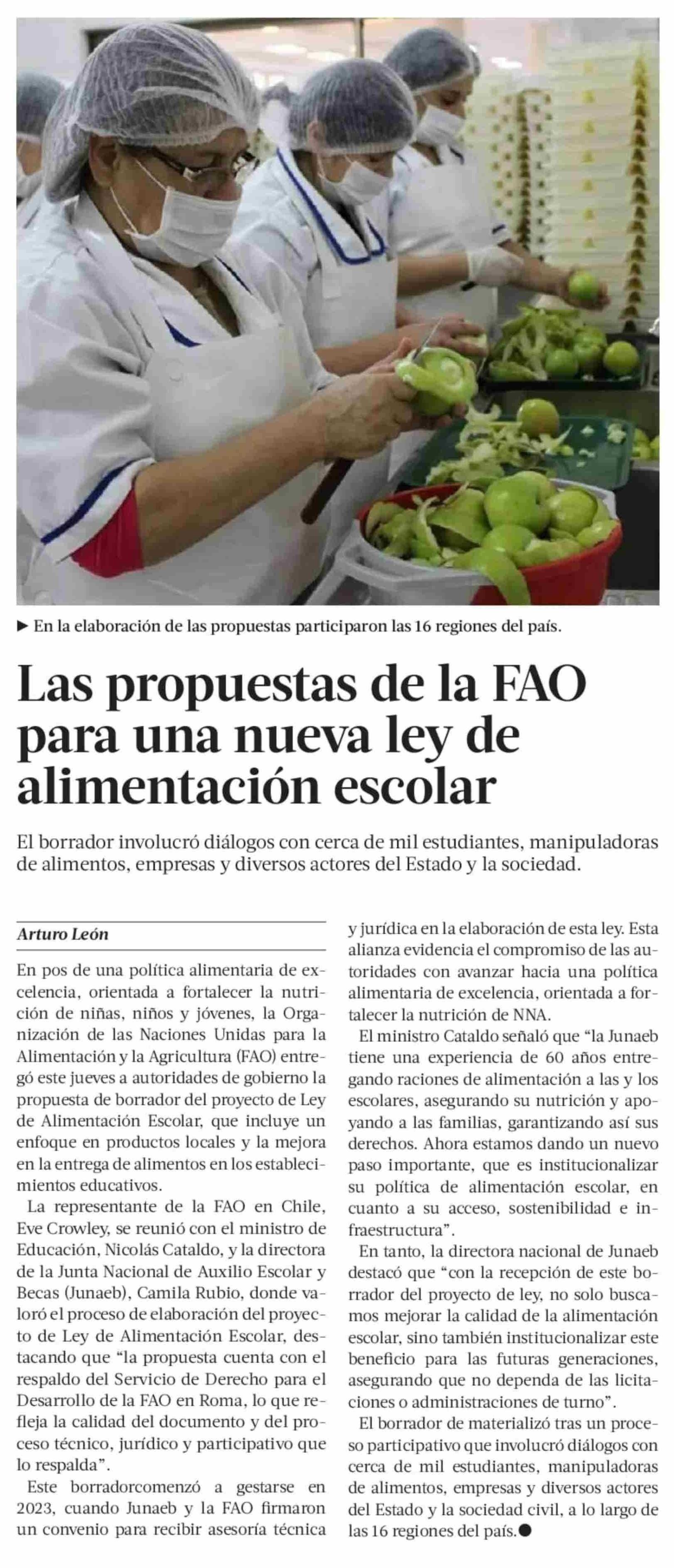 Las propuestas de la FAO para una nueva ley de alimentación escolar 16-05-2025 La Tercera |