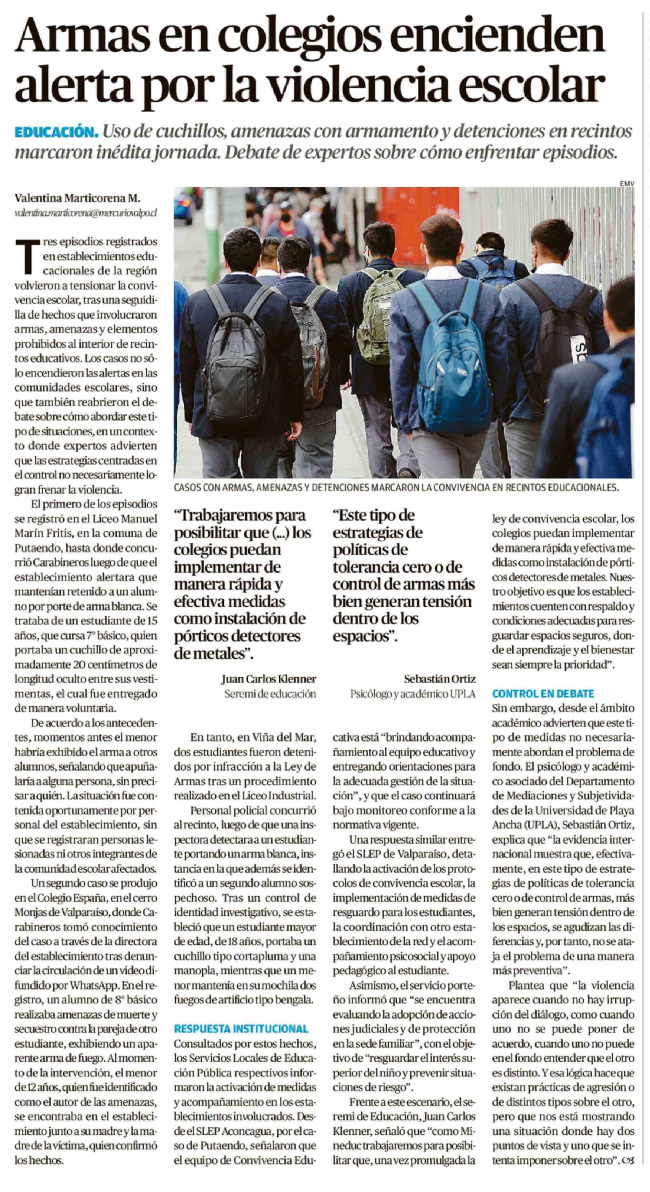 Armas en colegios encienden alerta por la violencia escolar 01-04-2026 El Mercurio de Valparaíso |
