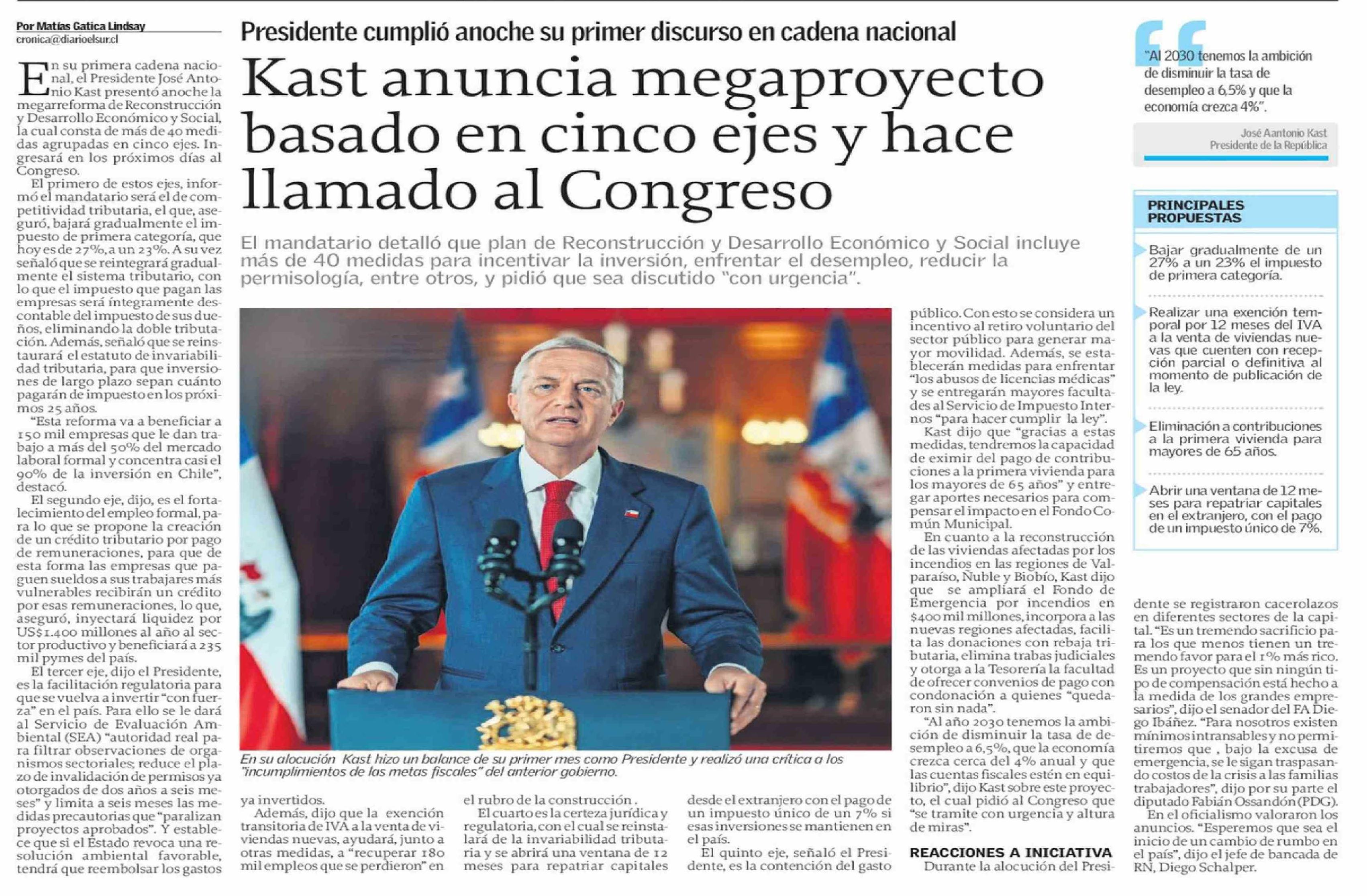 Título: Kast anuncia megaproyecto basado en cinco ejes y hace llamado al Congreso