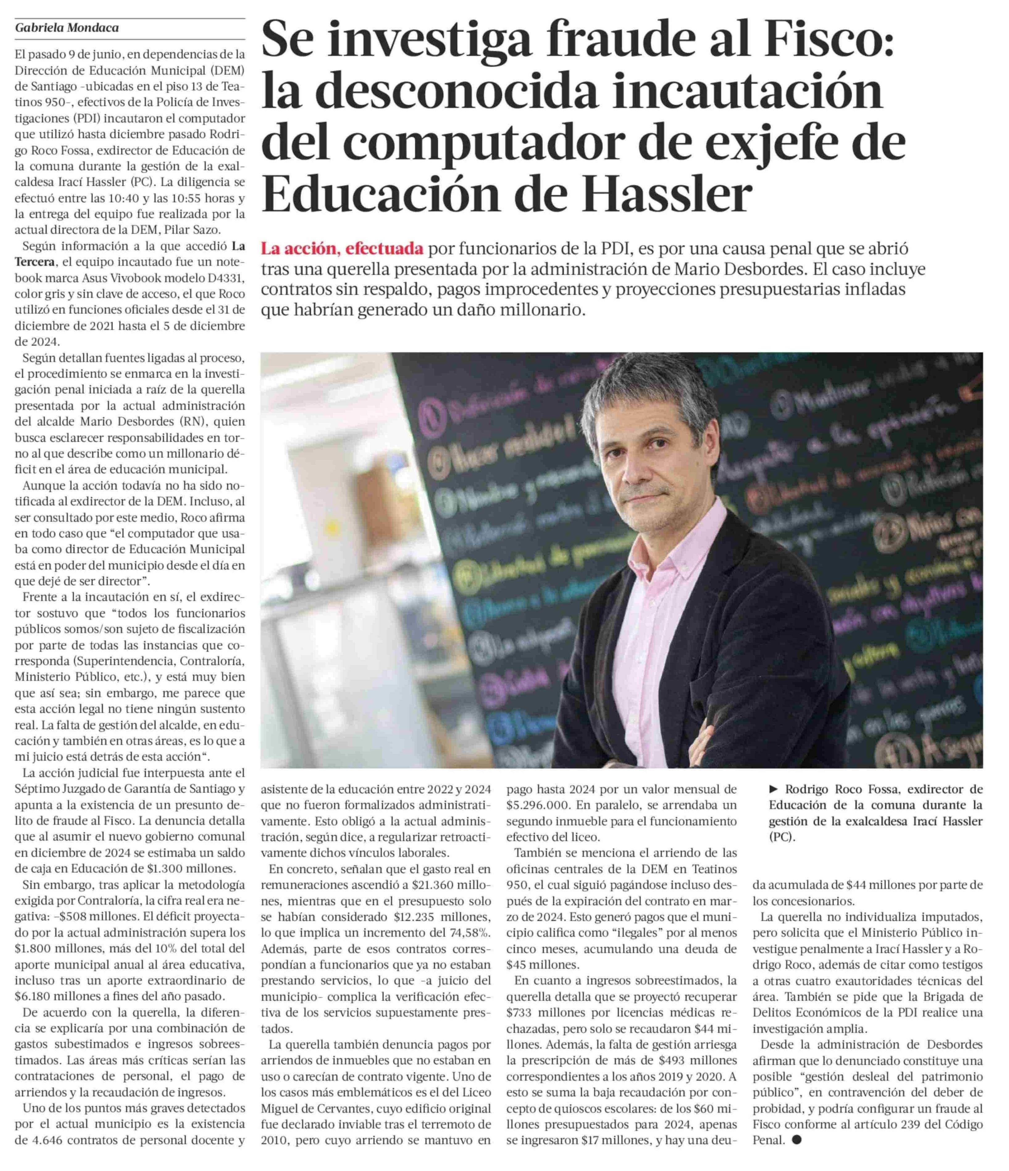 Se investiga fraude al Fisco: la desconocida incautación del computador de exjefe de Educación de Hassler 18-06-2025 La Tercera |