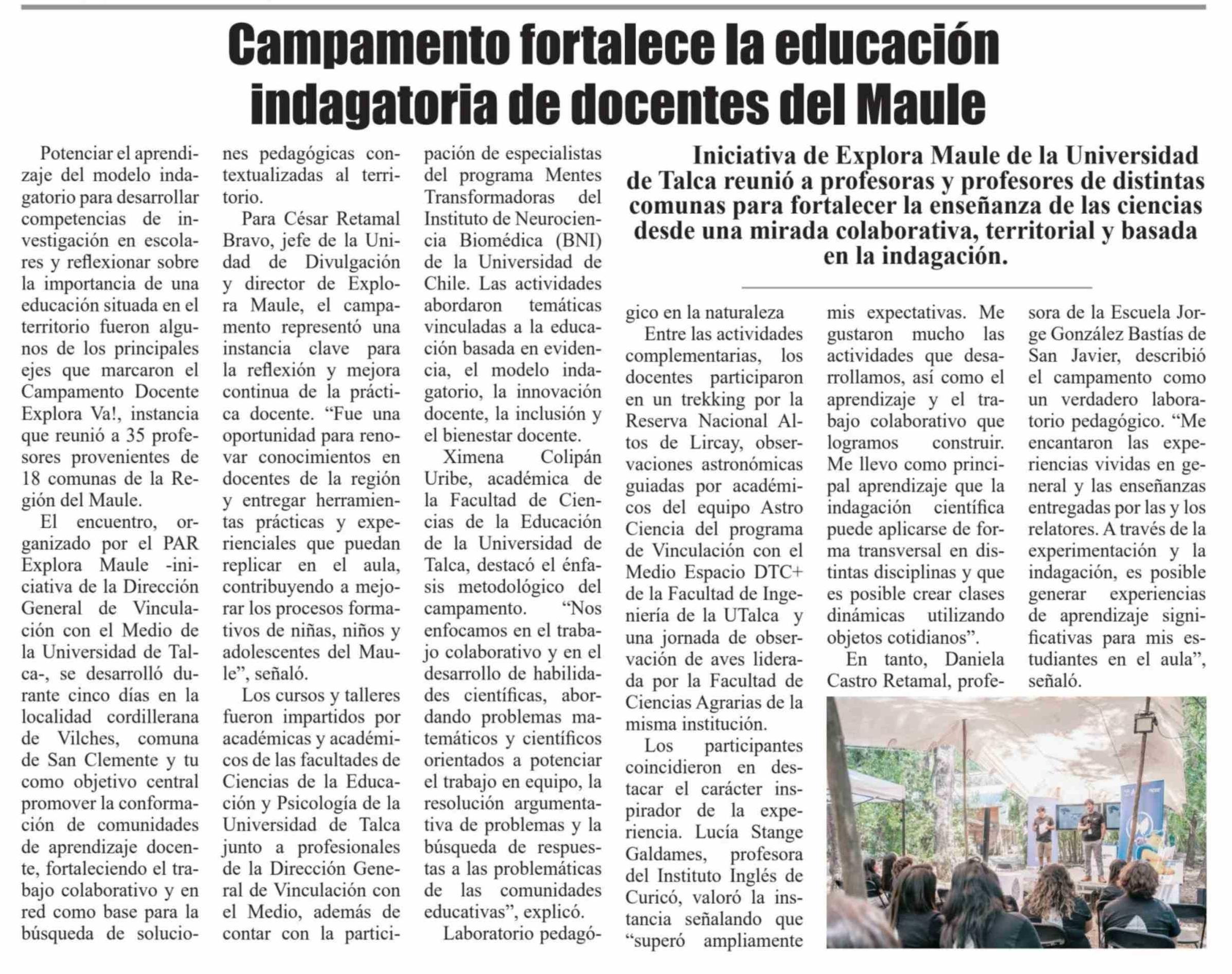 Título: Campamento fortalece la educación indagatoria de docentes del Maule