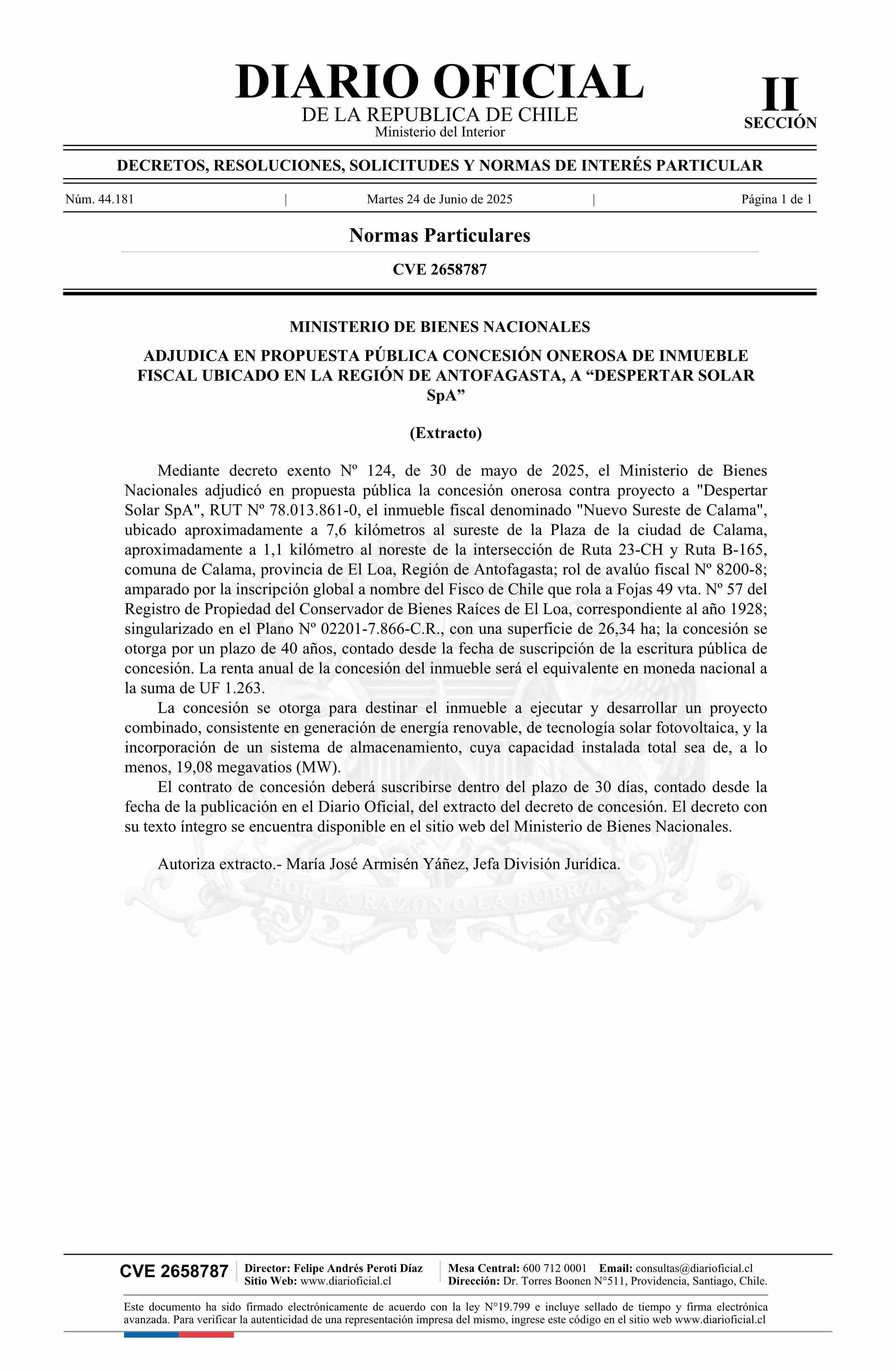 | Título: | Extracto de decreto exento número 124, de 2025.- Adjudica en propuesta pública concesión onerosa de inmueble fiscal ubicado en la Región de Antofagasta, a Despertar Solar SpA |