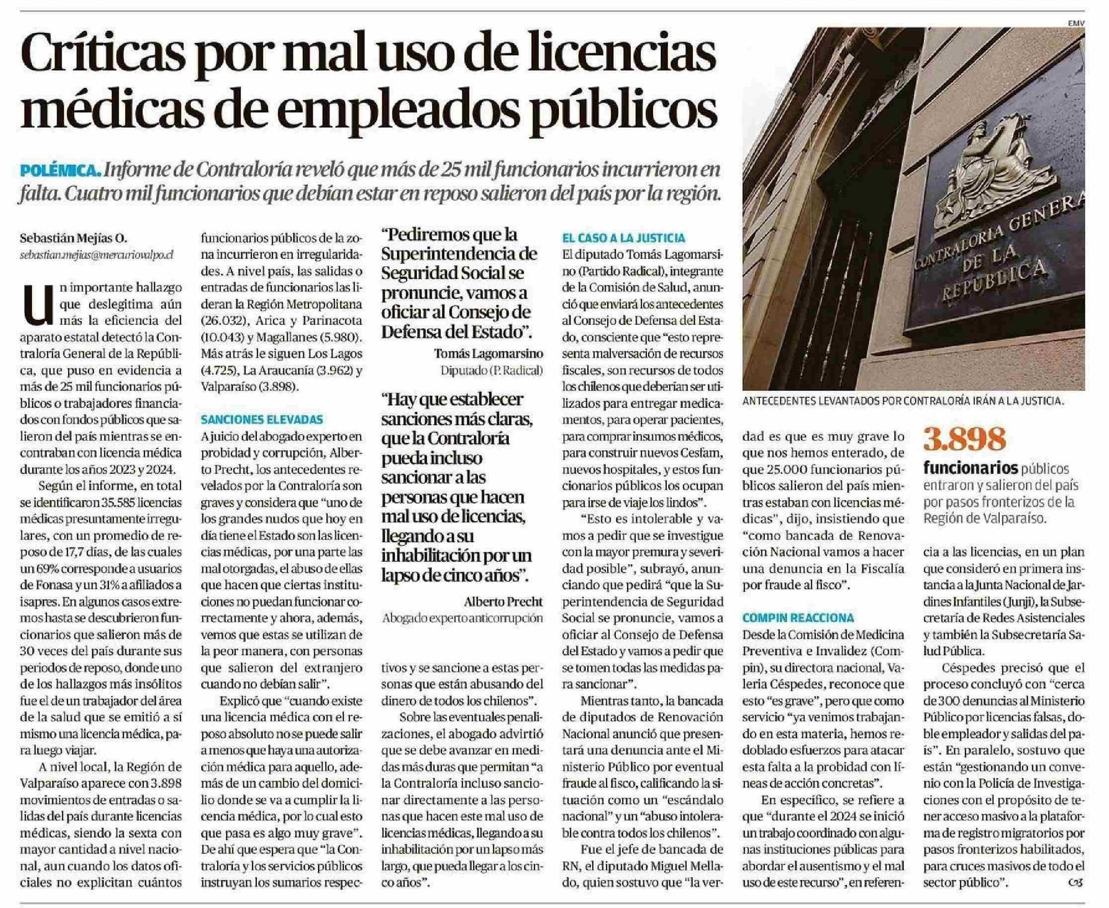 Críticas por mal uso de licencias médicas de empleados públicos 21-05-2025 El Mercurio de Valparaíso |