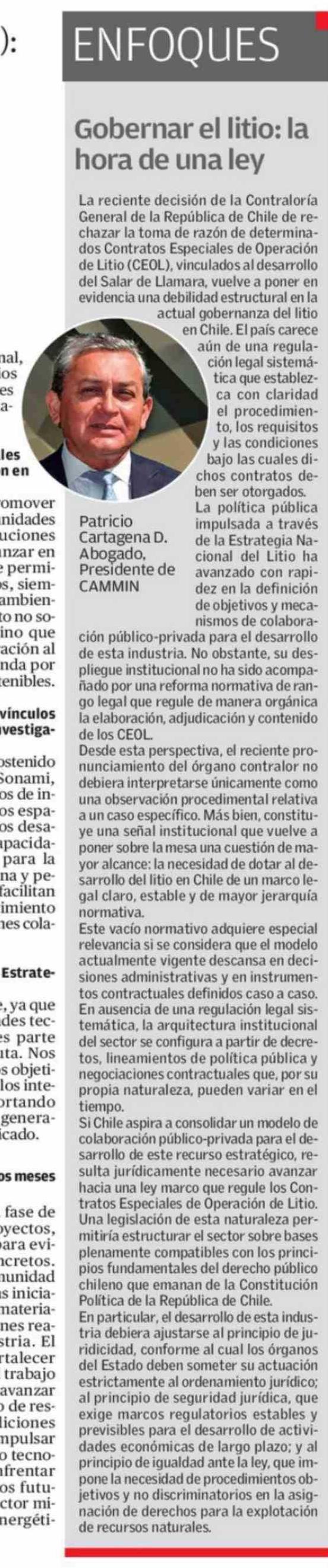 | Título: | Columnas de Opinión: Gobernar el litio: la hora de una ley |