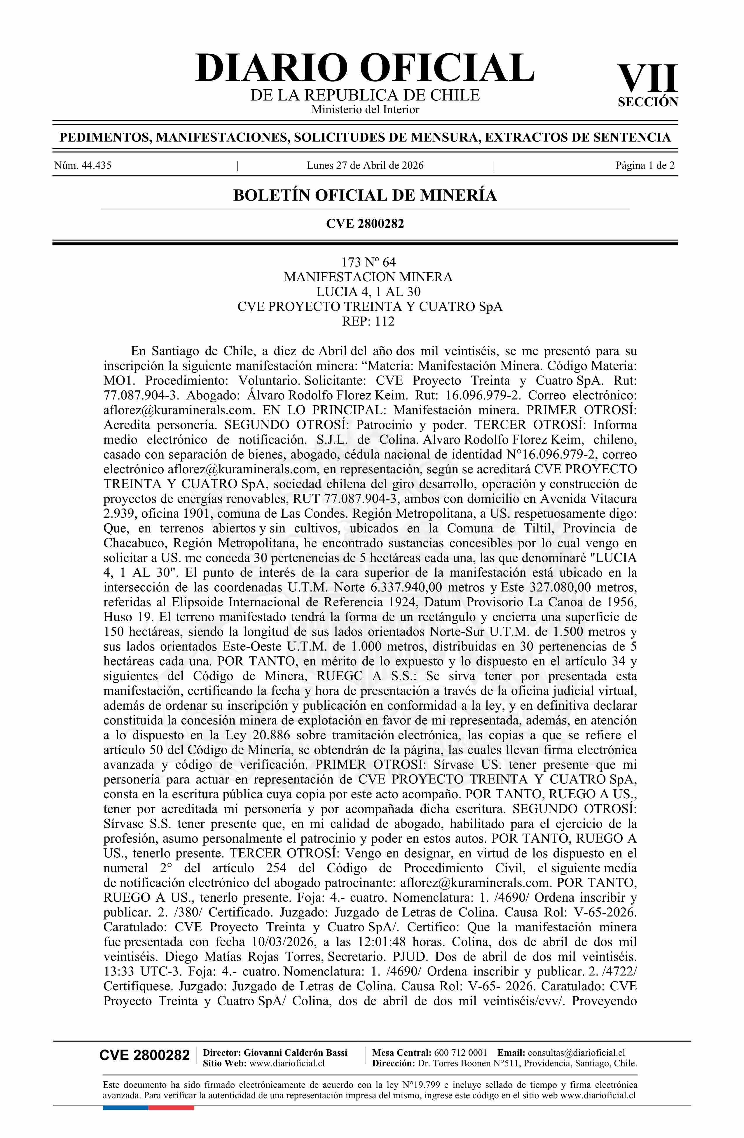 LUCIA 4, 1 AL 30 / CVE Proyecto Treinta y Cuatro SpA 27-04-2026 DIARIO OFICIAL CHILE - BOLETÍN OFICIAL DE MINERÍA |