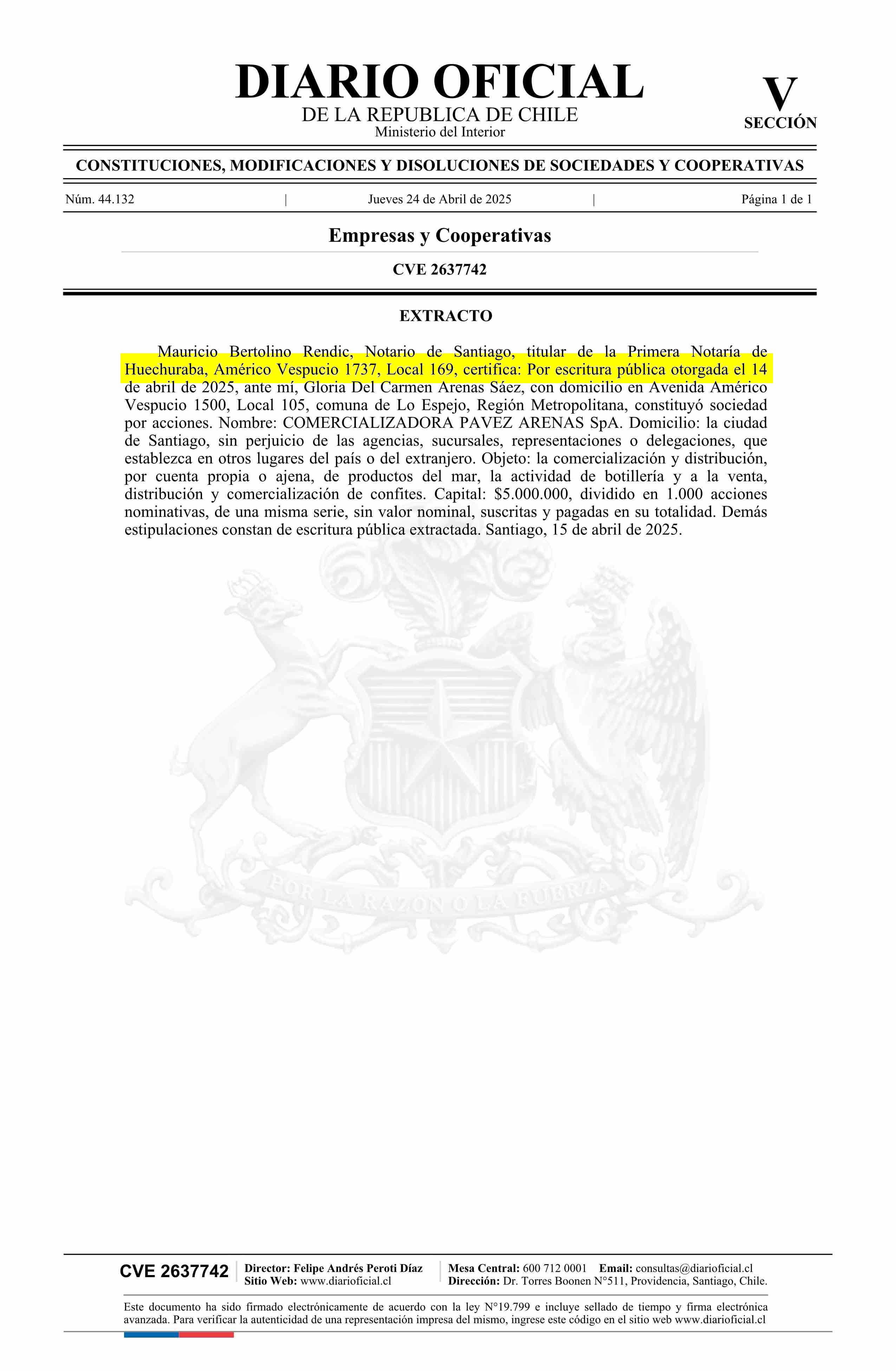 COMERCIALIZADORA PAVEZ ARENAS SpA 24-04-2025 Diario Oficial Edición Electrónica |