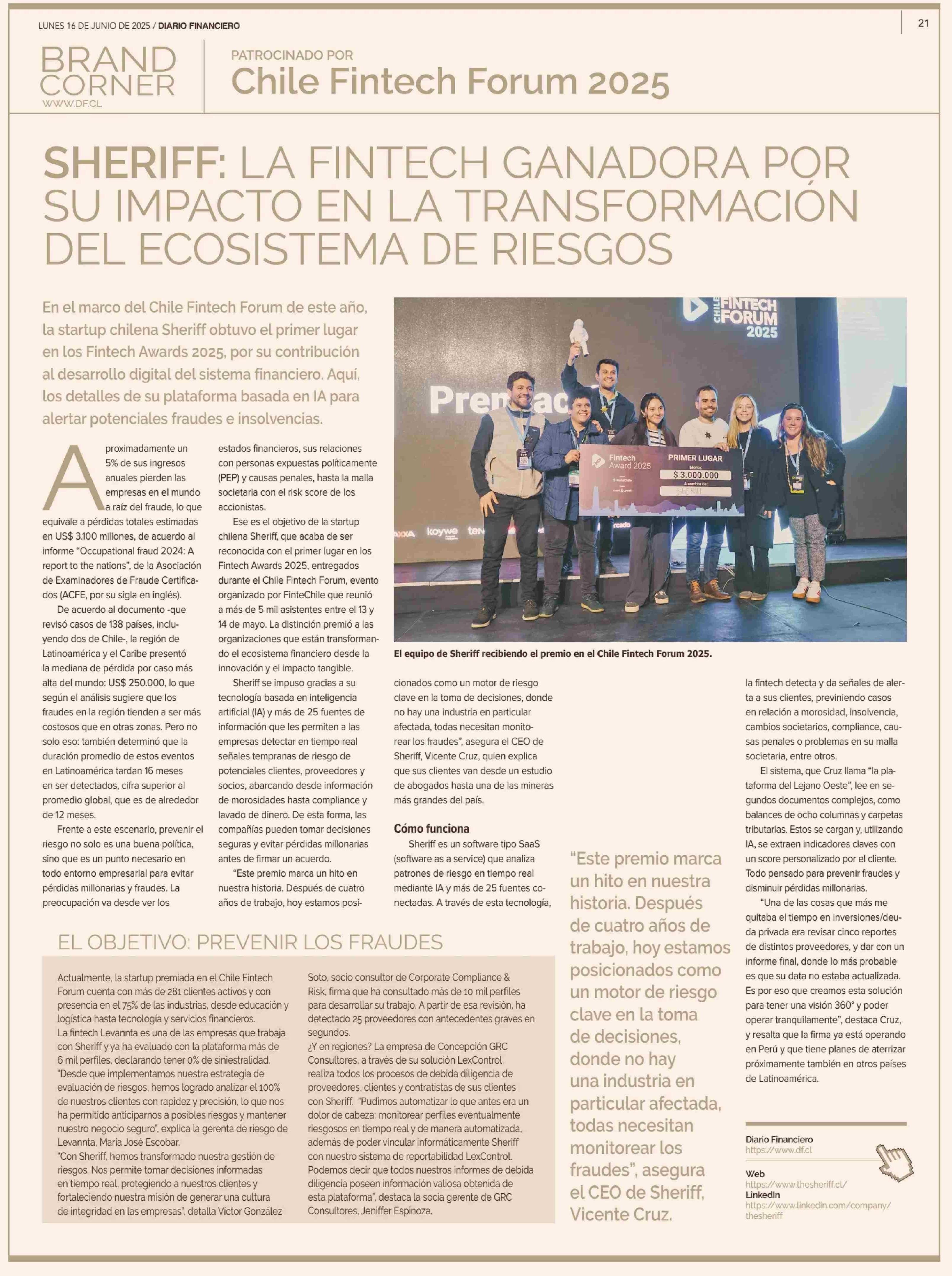 SHERIFF: LA FINTECH GANADORA POR SU IMPACTO EN LA TRANSFORMACIÓN DEL ECOSISTEMA DE RIESGOS 16-06-2025 Diario Financiero |