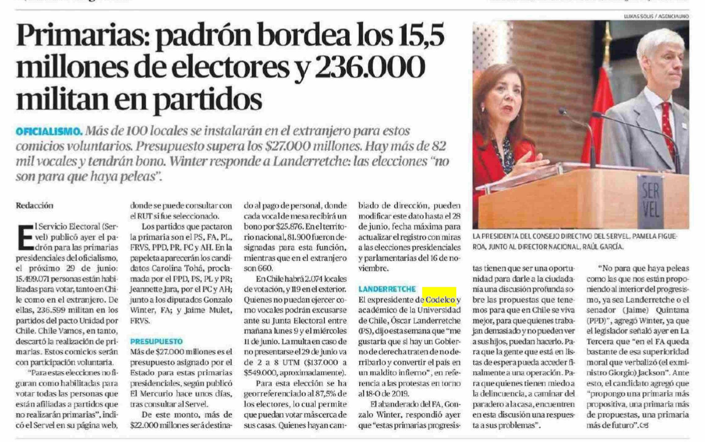 Primarias: padrón bordea los 15,5 millones de electores y 236.000 militan en partidos 08-06-2025 El Mercurio de Antofagasta |