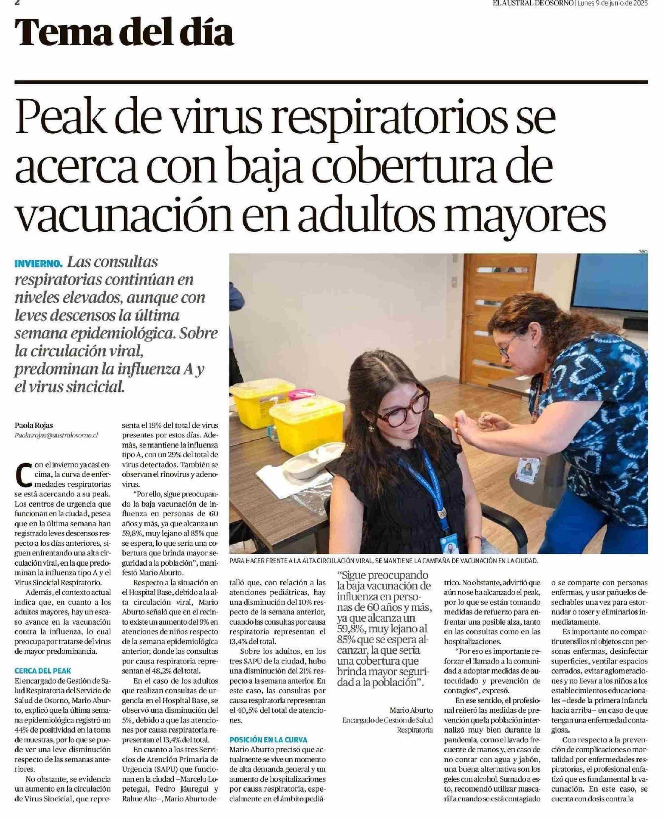 Peak de virus respiratorios se acerca con baja cobertura de vacunación en adultos mayores 09-06-2025 El Austral de Osorno |