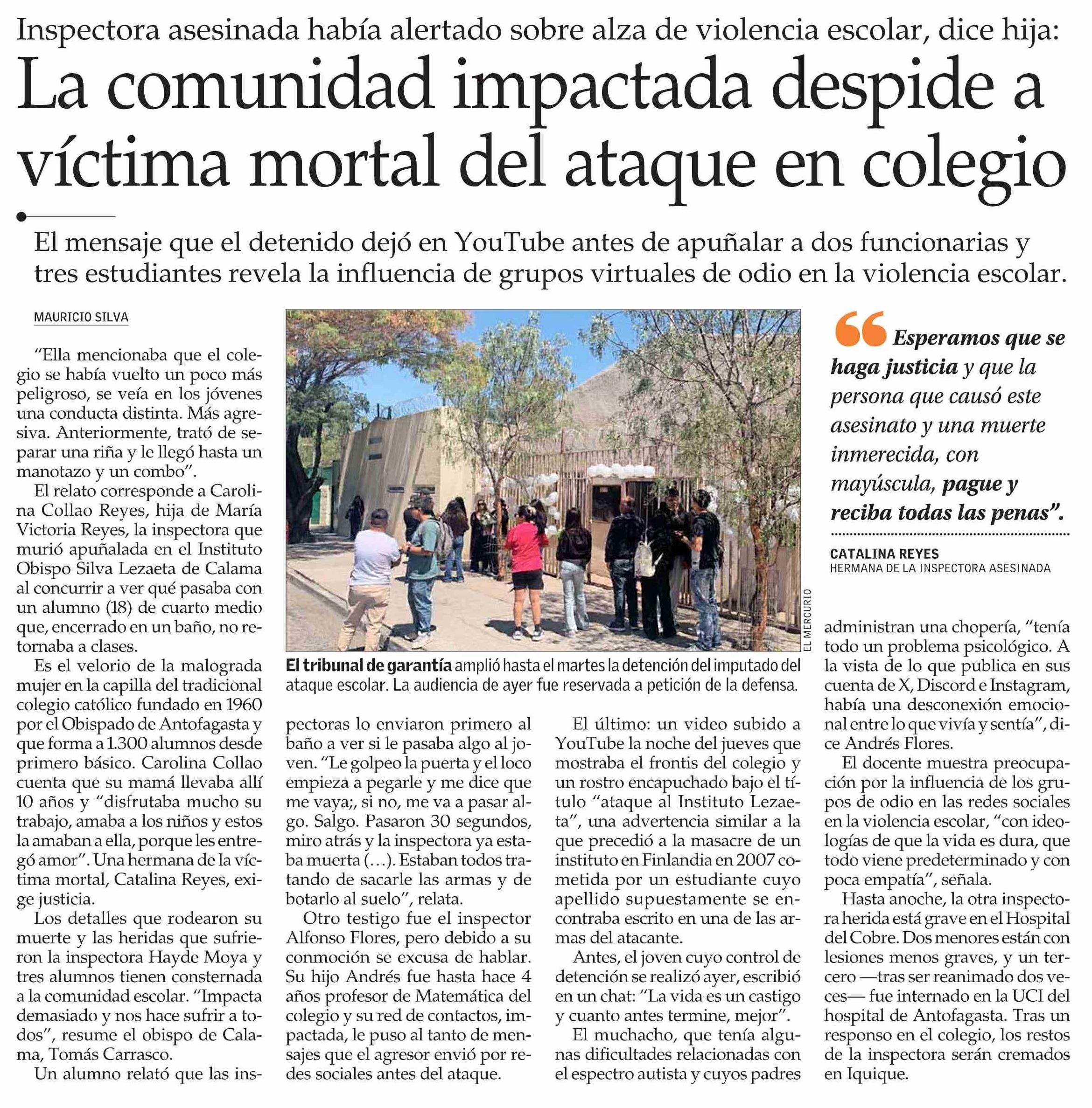 La comunidad impactada despide a víctima mortal del ataque en colegio 29-03-2026 El Mercurio |