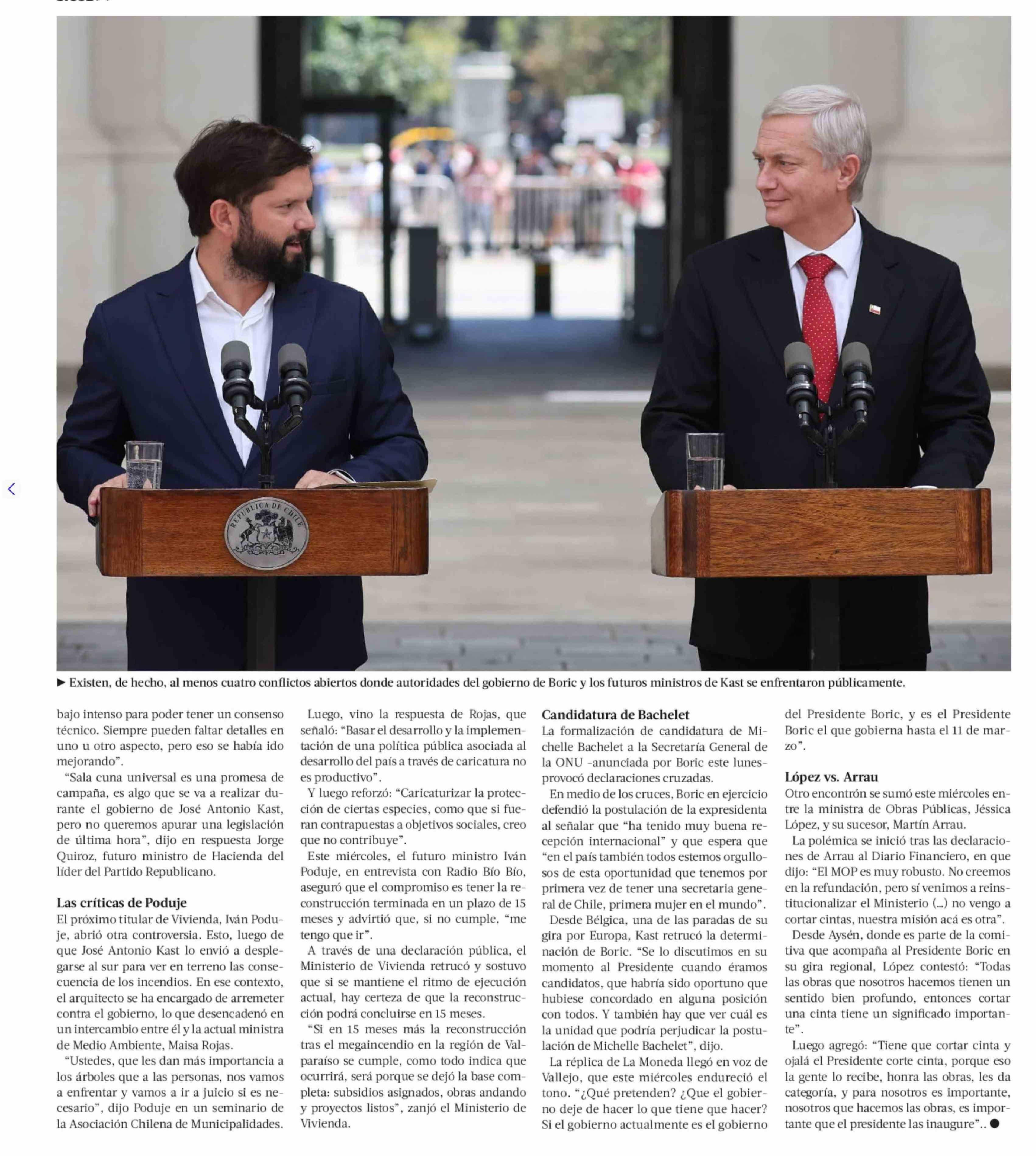 Sin tregua: las frases y roces entre La Moneda de Boric y el gobierno electo de Kast ad portas del cambio de mando 05-02-2026 La Tercera |