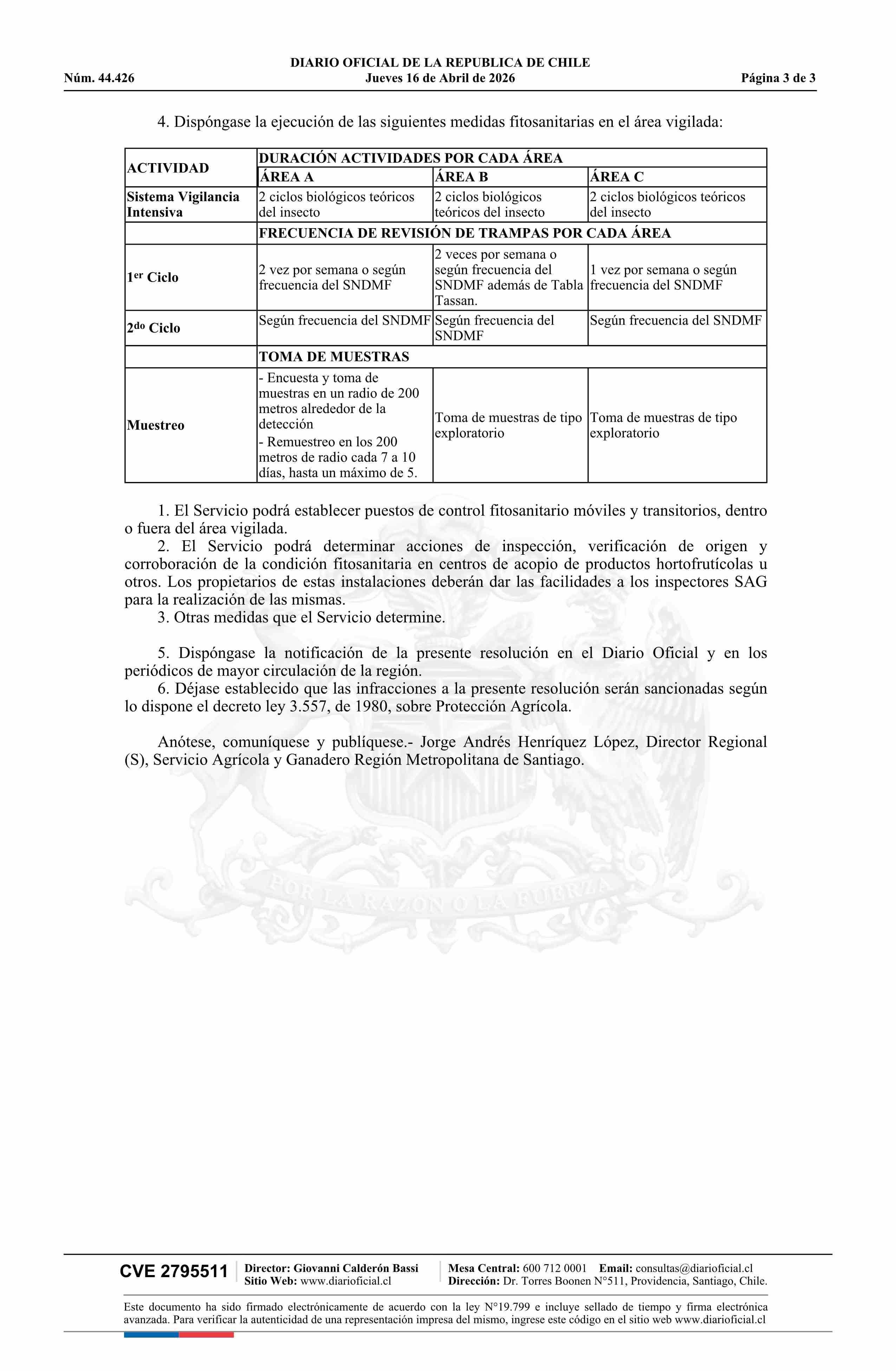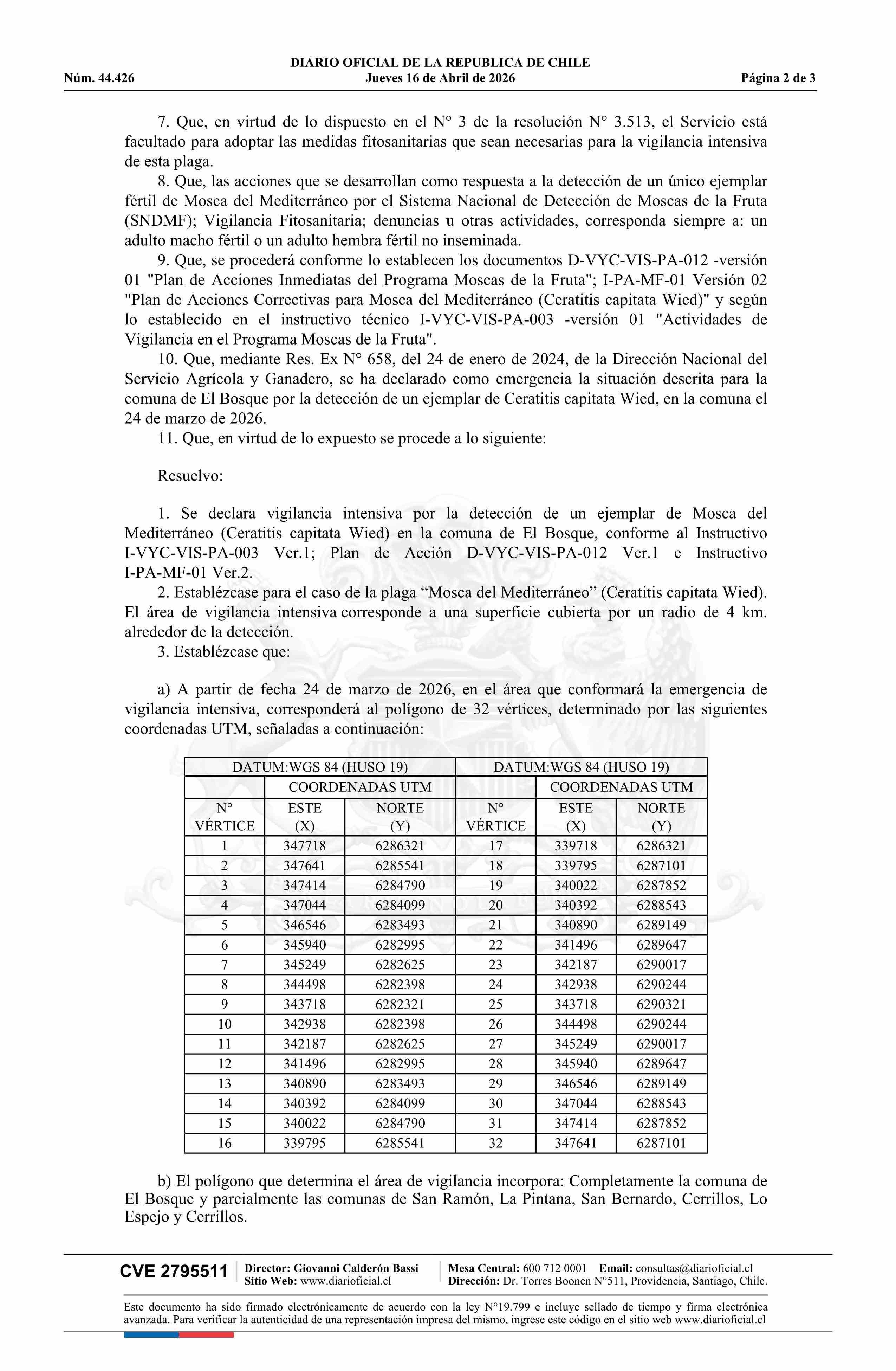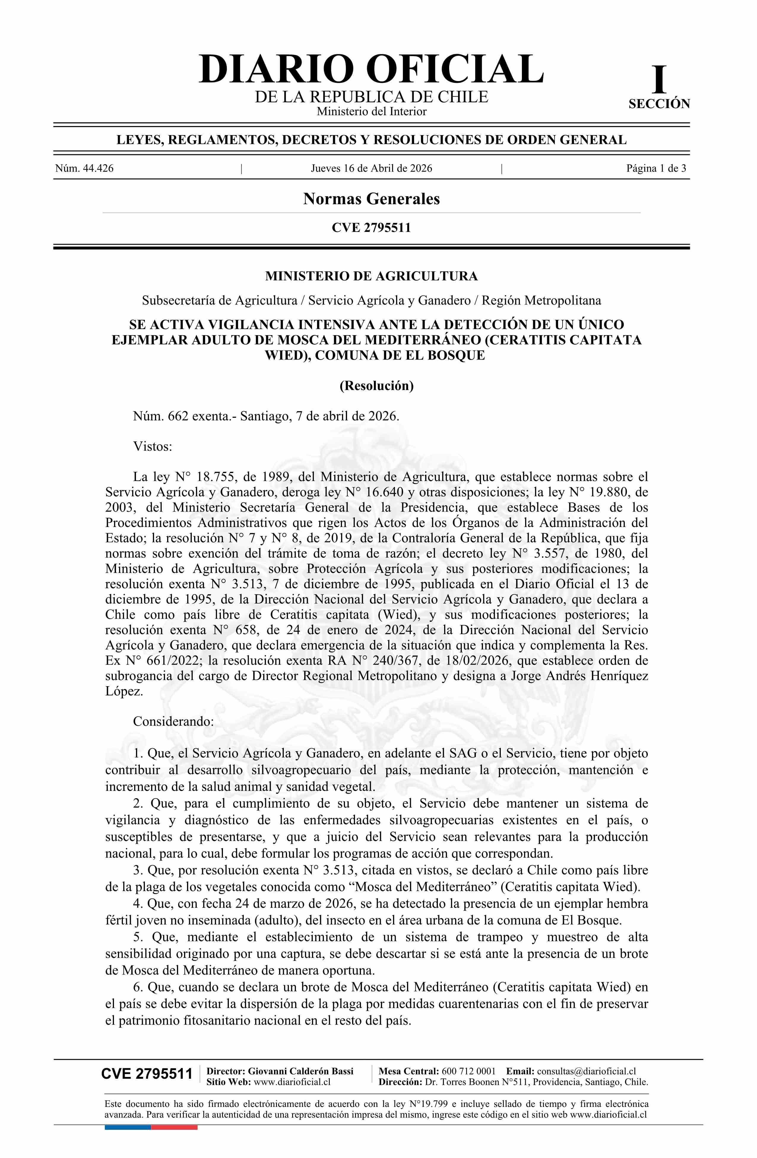 | Título: | Resolución exenta número 662, de 2026.- Se activa vigilancia intensiva ante la detección de un único ejemplar adulto de Mosca del Mediterráneo (Ceratitis capitata Wied), comuna de El Bosque |