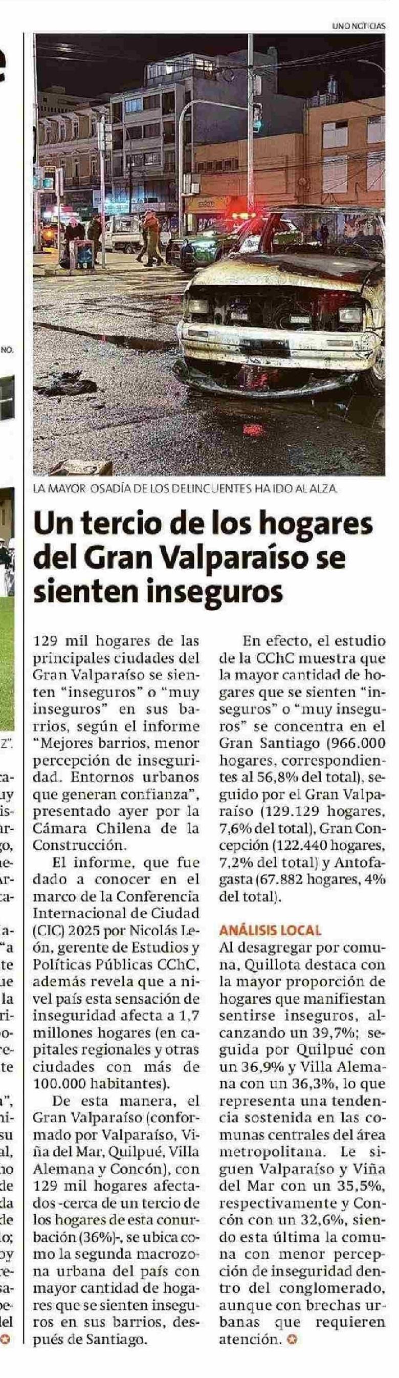 Un tercio de los hogares del Gran Valparaíso se sienten inseguros 19-06-2025 La Estrella de Valparaíso |