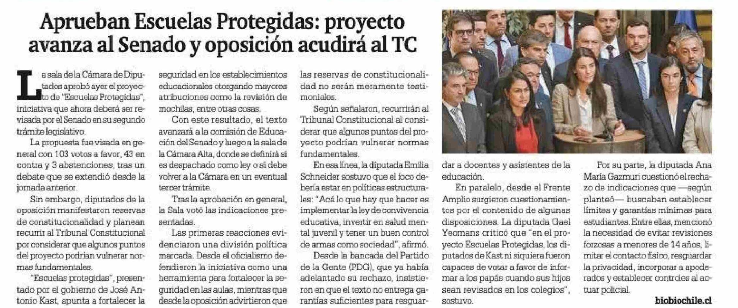 | Título: | Aprueban Escuelas Protegidas: proyecto avanza al Senado y oposición acudirá al TC |