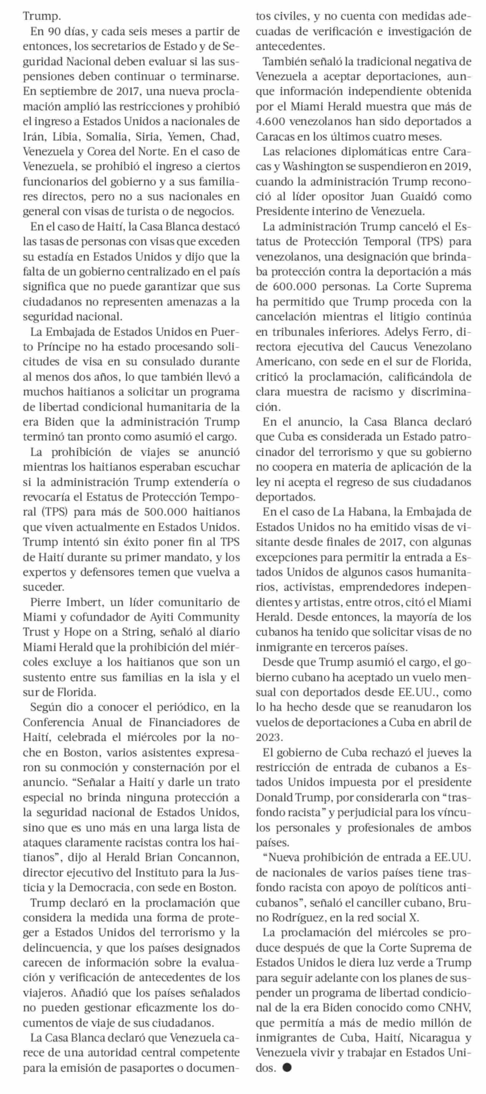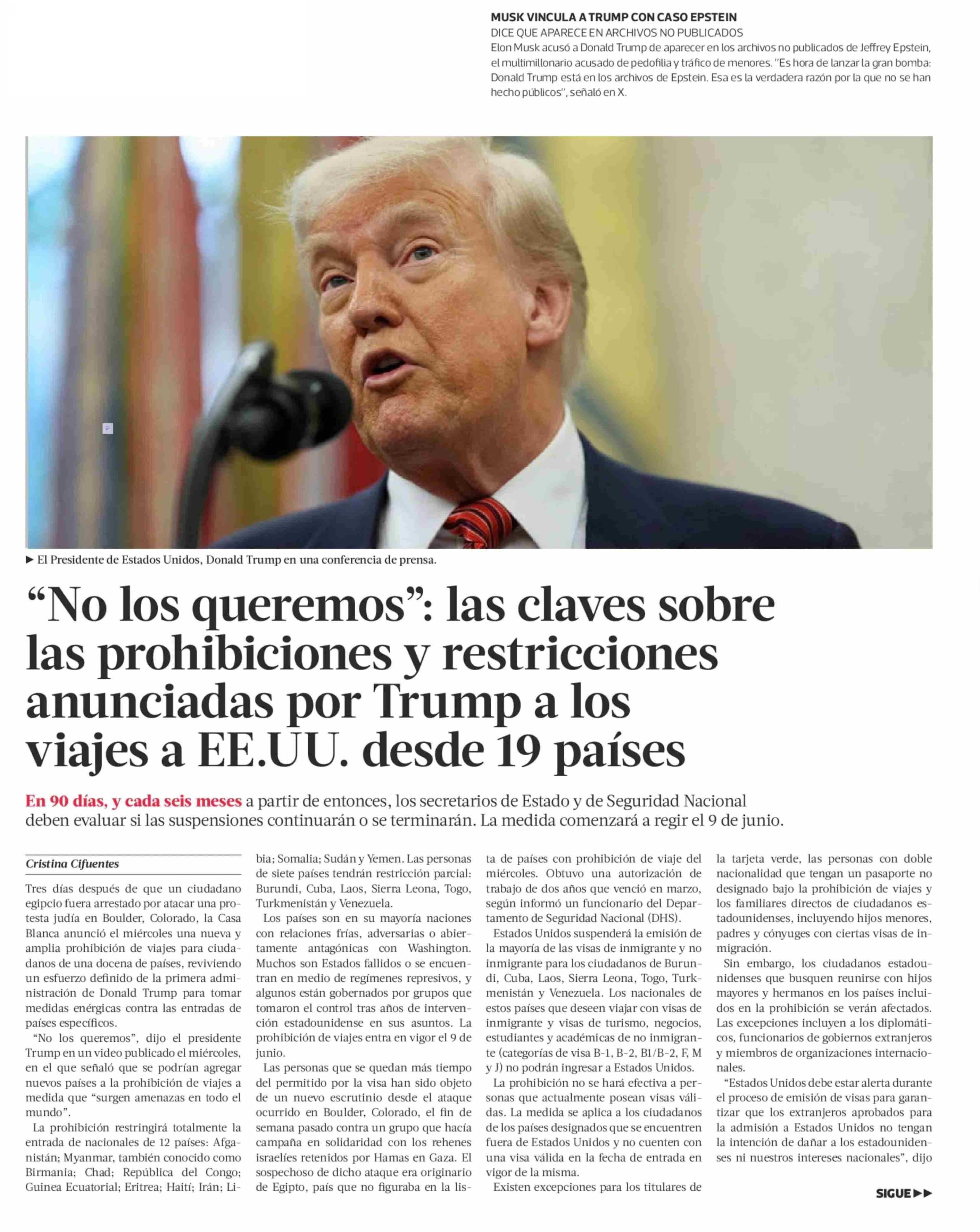 “No los queremos”: las claves sobre las prohibiciones y restricciones anunciadas por Trump a los viajes a EE.UU. desde 19 países 06-06-2025 La Tercera |