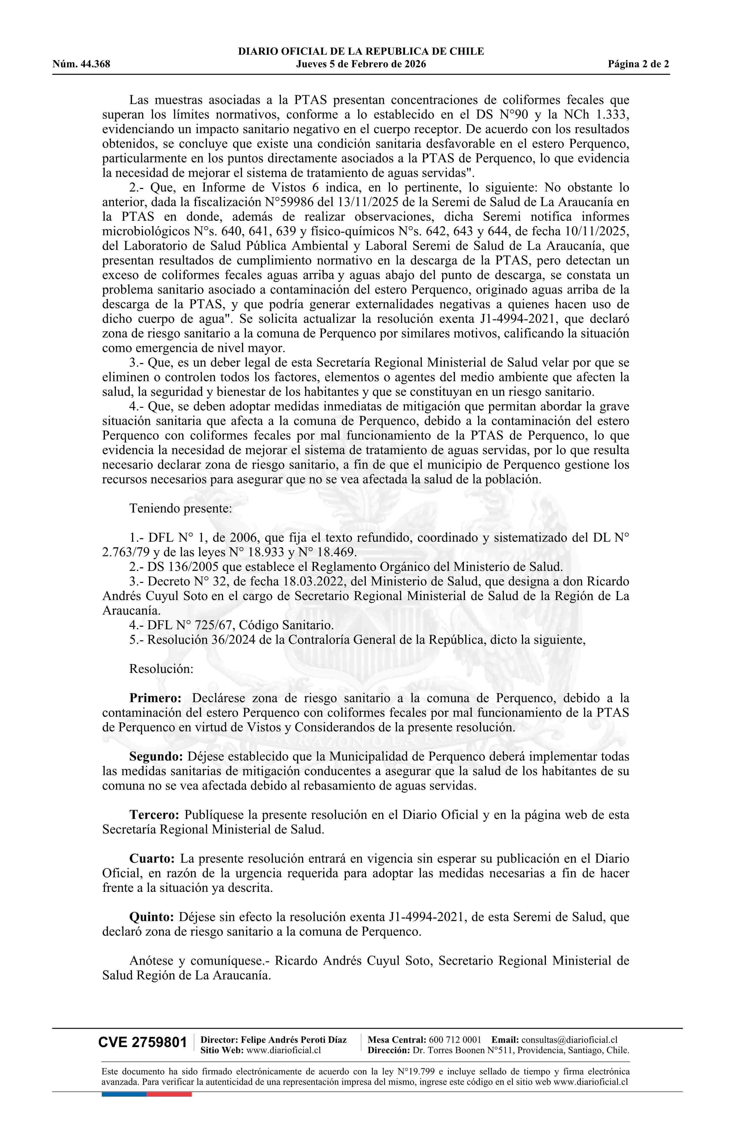 Título: Resolución exenta número CP 880, de 2026.- Declara zona de riesgo sanitario