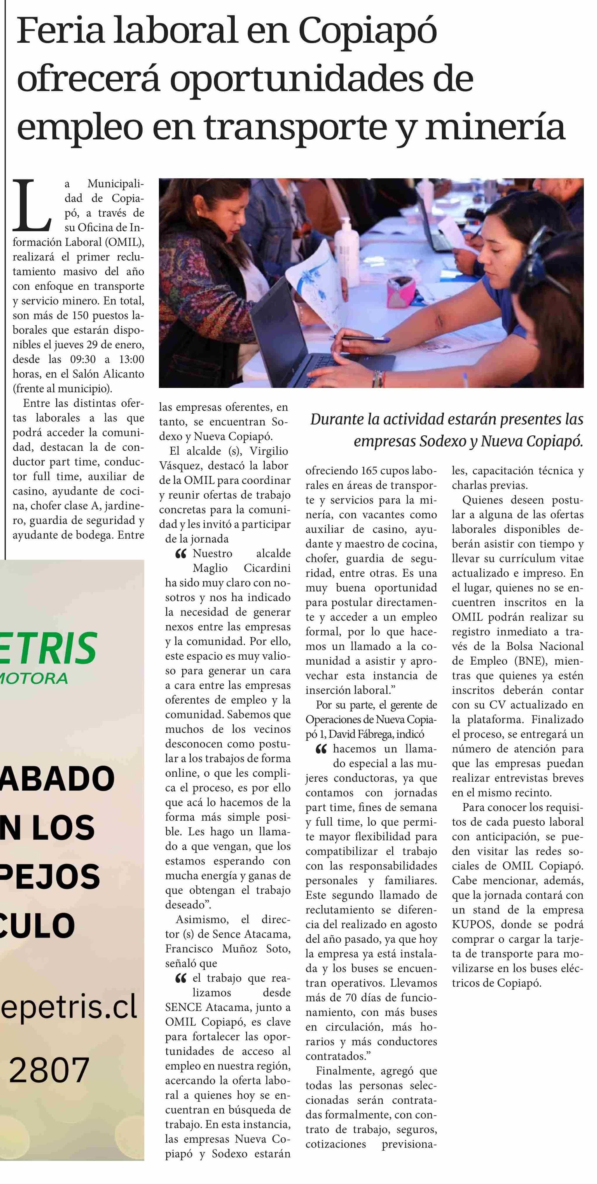 Feria laboral en Copiapó ofrecerá oportunidades de empleo en transporte y minería 26-01-2026 Diario Chañarcillo |