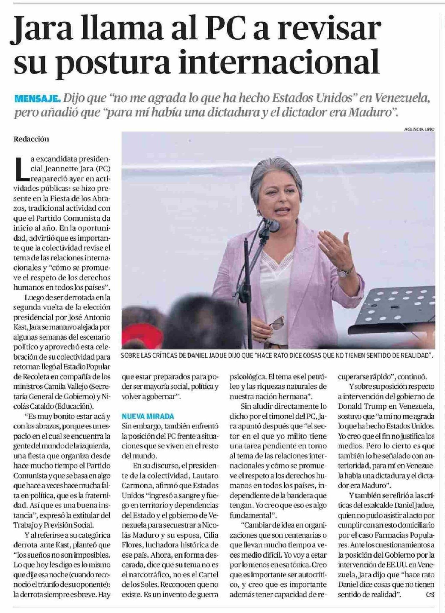 Jara llama al PC a revisar su postura internacional 11-01-2026 El Diario de Atacama |
