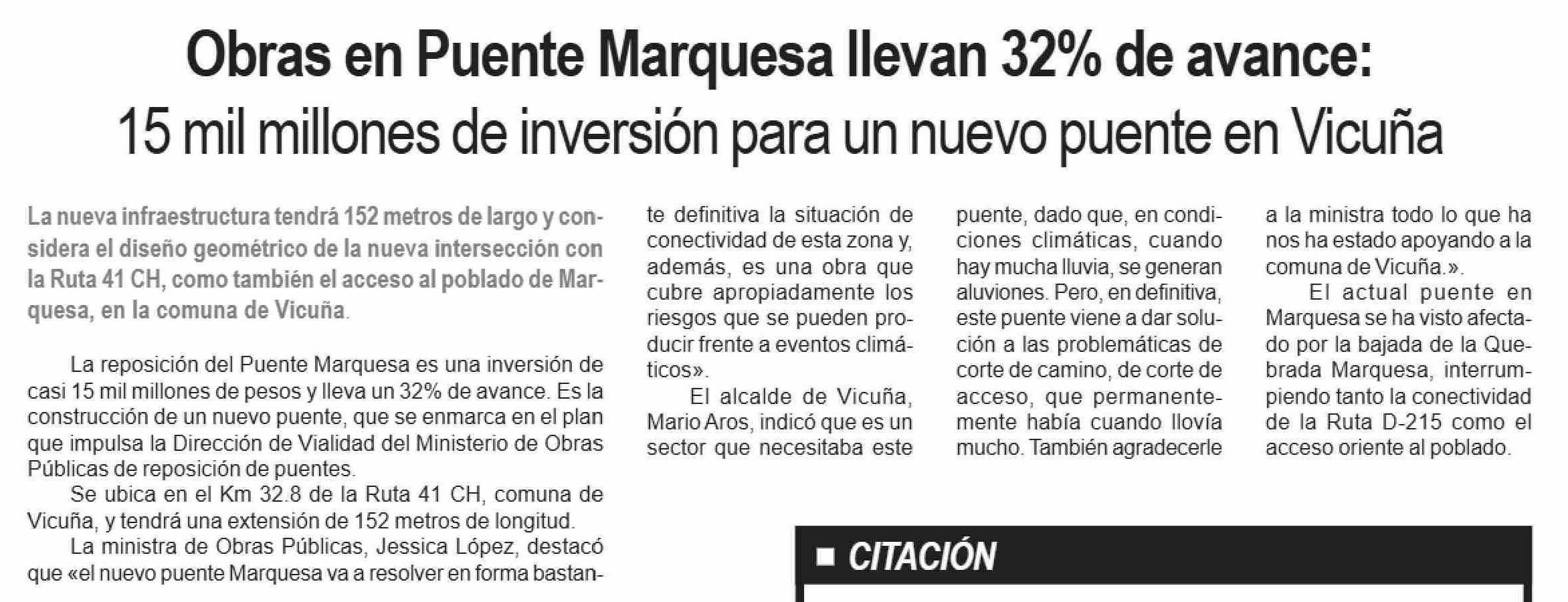 | Título: | Obras en Puente Marquesa llevan 32% de avance: 15 mil millones de inversión para un nuevo puente en Vicuña |