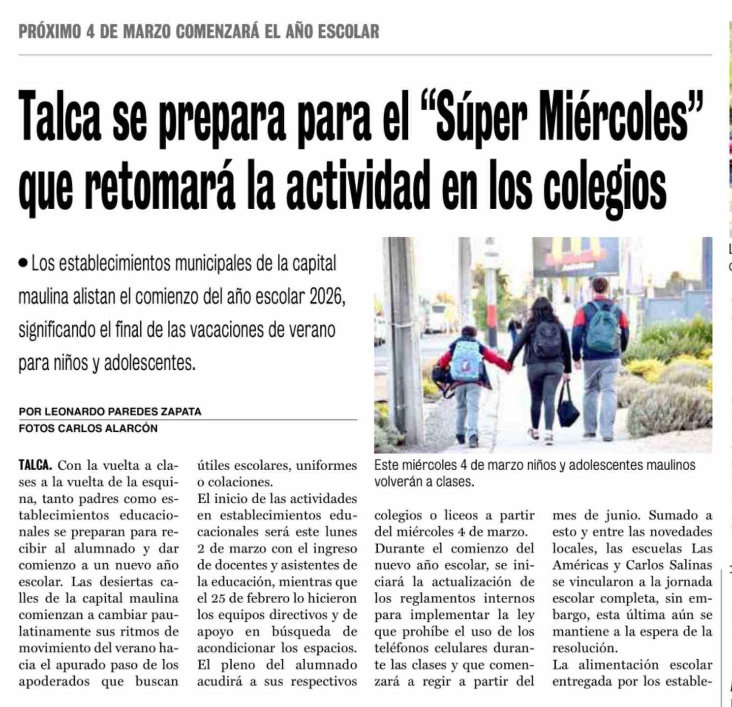 Talca se prepara para el "Súper Miércoles" que retomará la actividad en los colegios 28-02-2026 La Prensa de Curicó |
