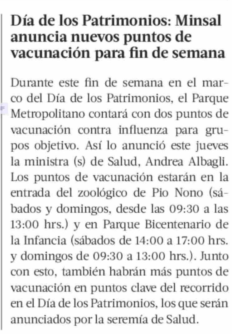 Título: Día de los Patrimonios: Minsal anuncia nuevos puntos de vacunación para fin de semana