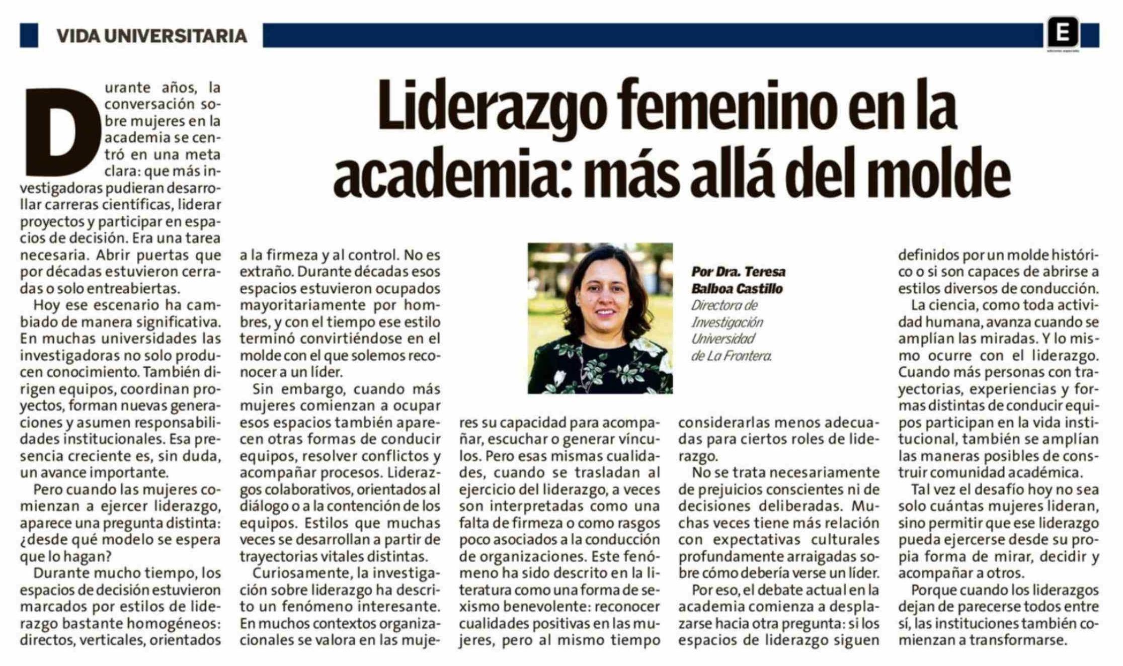 Liderazgo femenino en la academia: más allá del molde 08-03-2026 El Austral de la Araucanía |