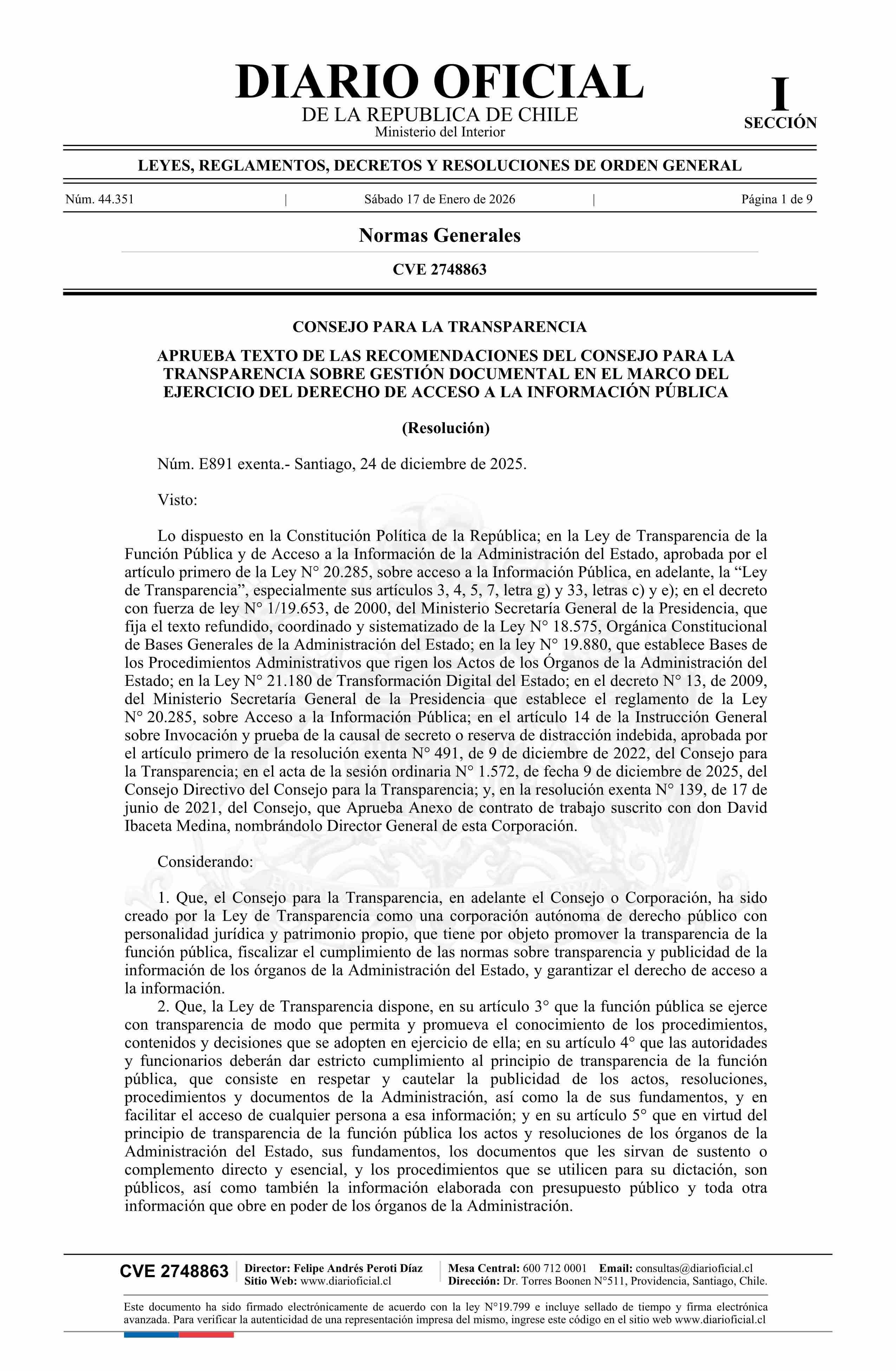 Título: Resolución exenta número E891, de 2025.- Aprueba texto de las recomendaciones del Consejo para la Transparencia sobre Gestión Documental en el marco del ejercicio del derecho de acceso a la información pública