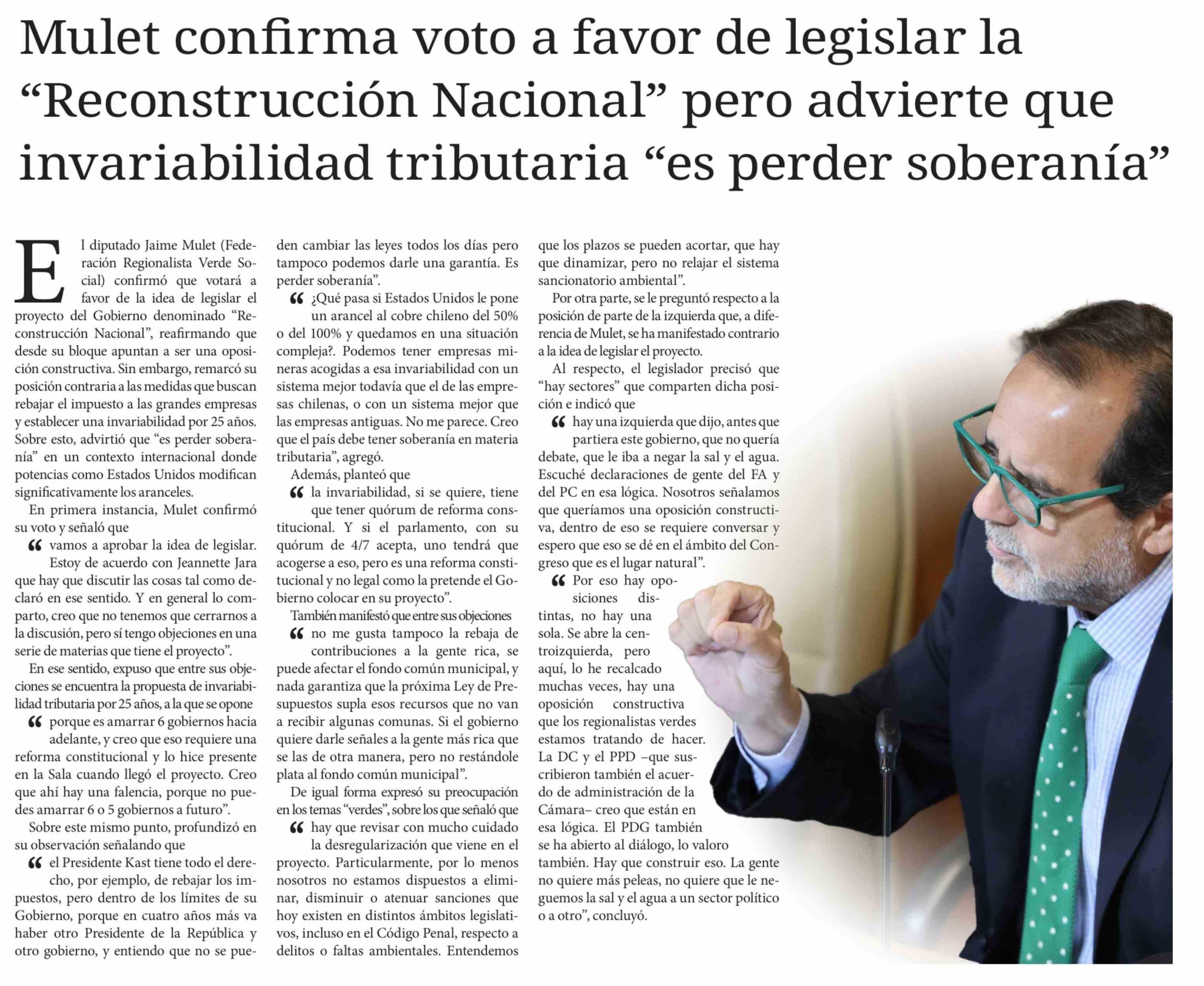 Mulet confirma voto a favor de legislar la "Reconstrucción Nacional" pero advierte que invariabilidad tributaria "es perder soberanía" 23-04-2026 Diario Chañarcillo |