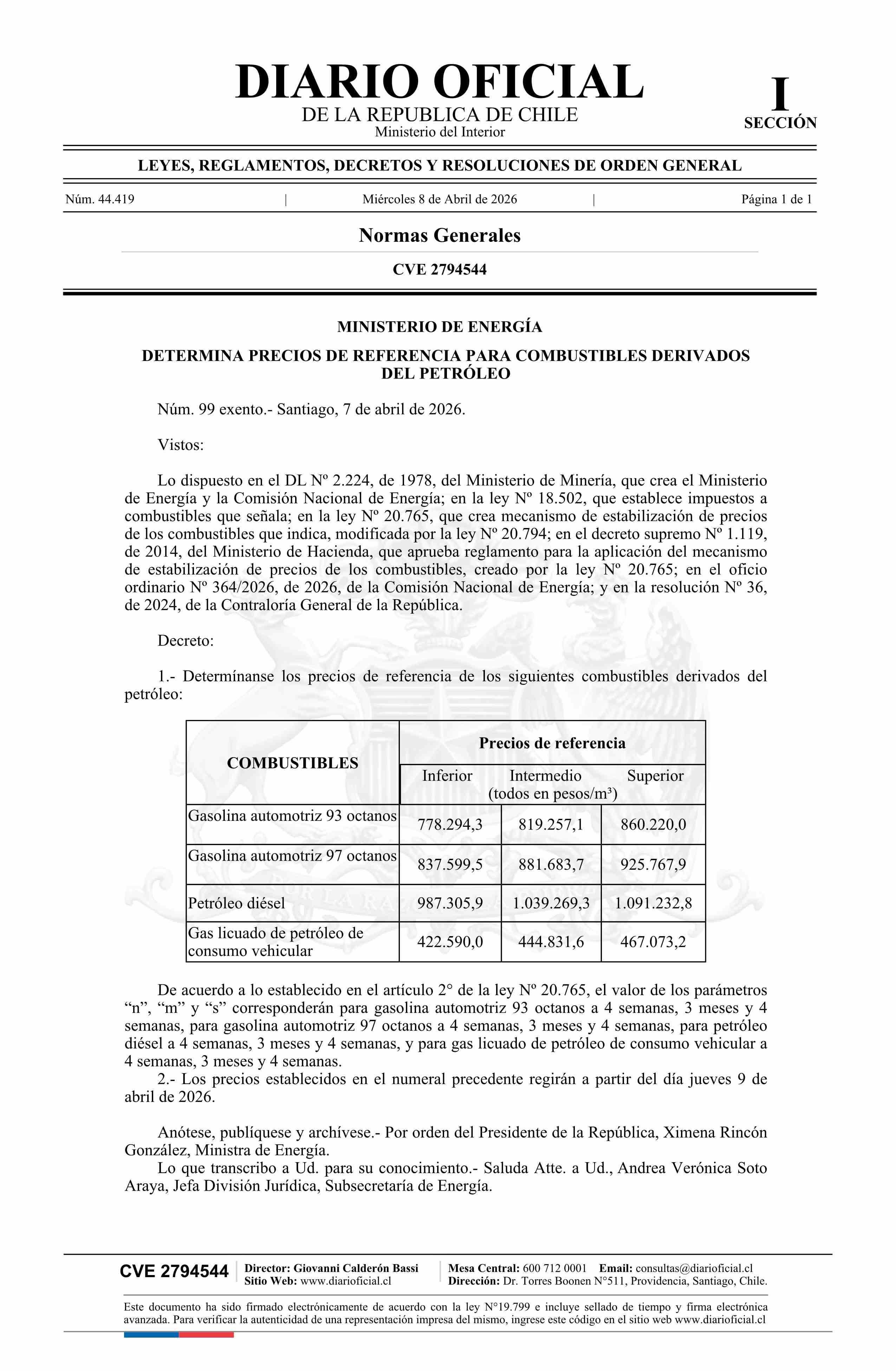 Decreto exento número 99, de 2026.- Determina precios de referencia para combustibles derivados del petróleo 08-04-2026 Diario Oficial Edición Electrónica |
