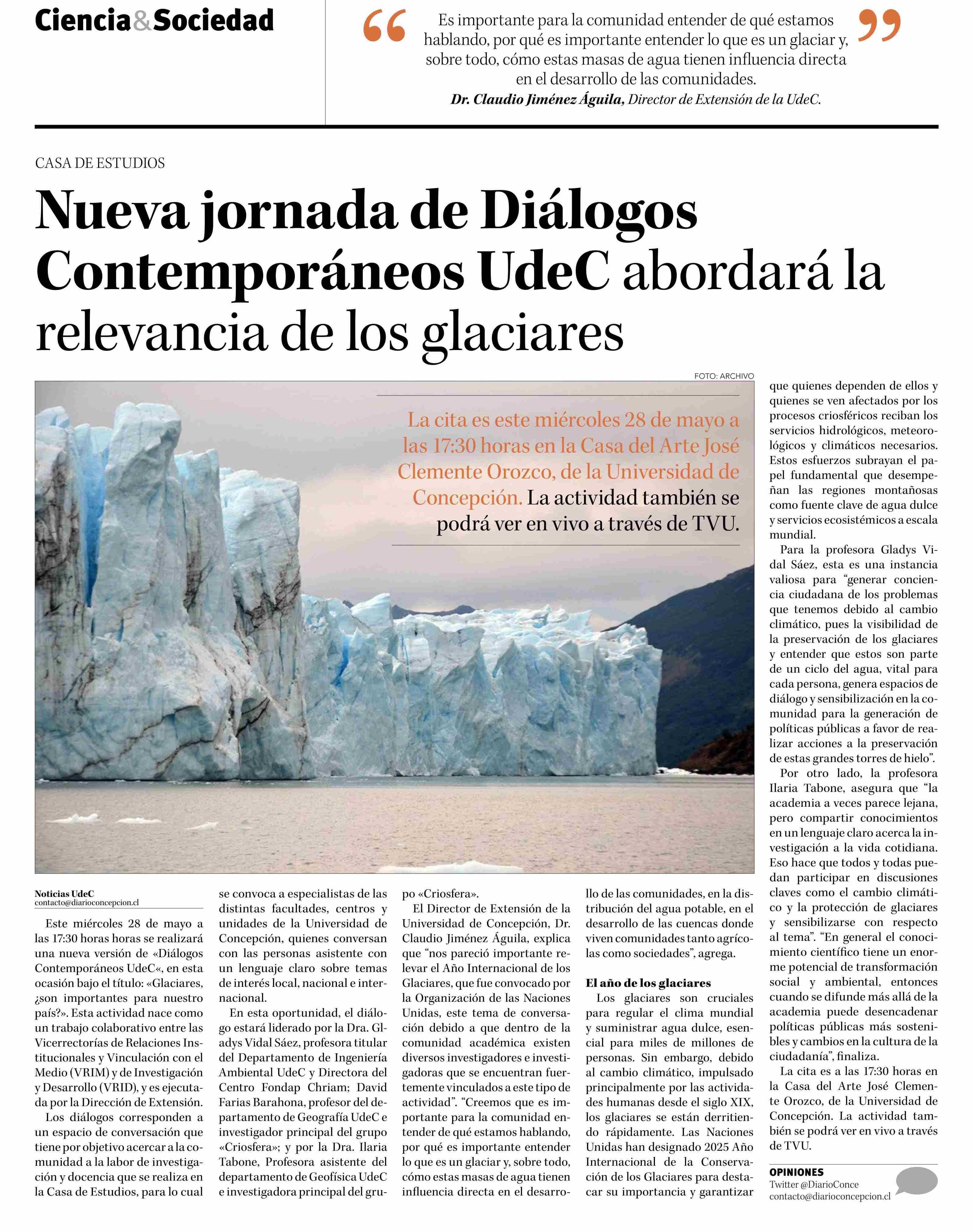 Nueva jornada de Diálogos Contemporáneos UdeC abordará la relevancia de los glaciares 28-05-2025 Diario Concepción |