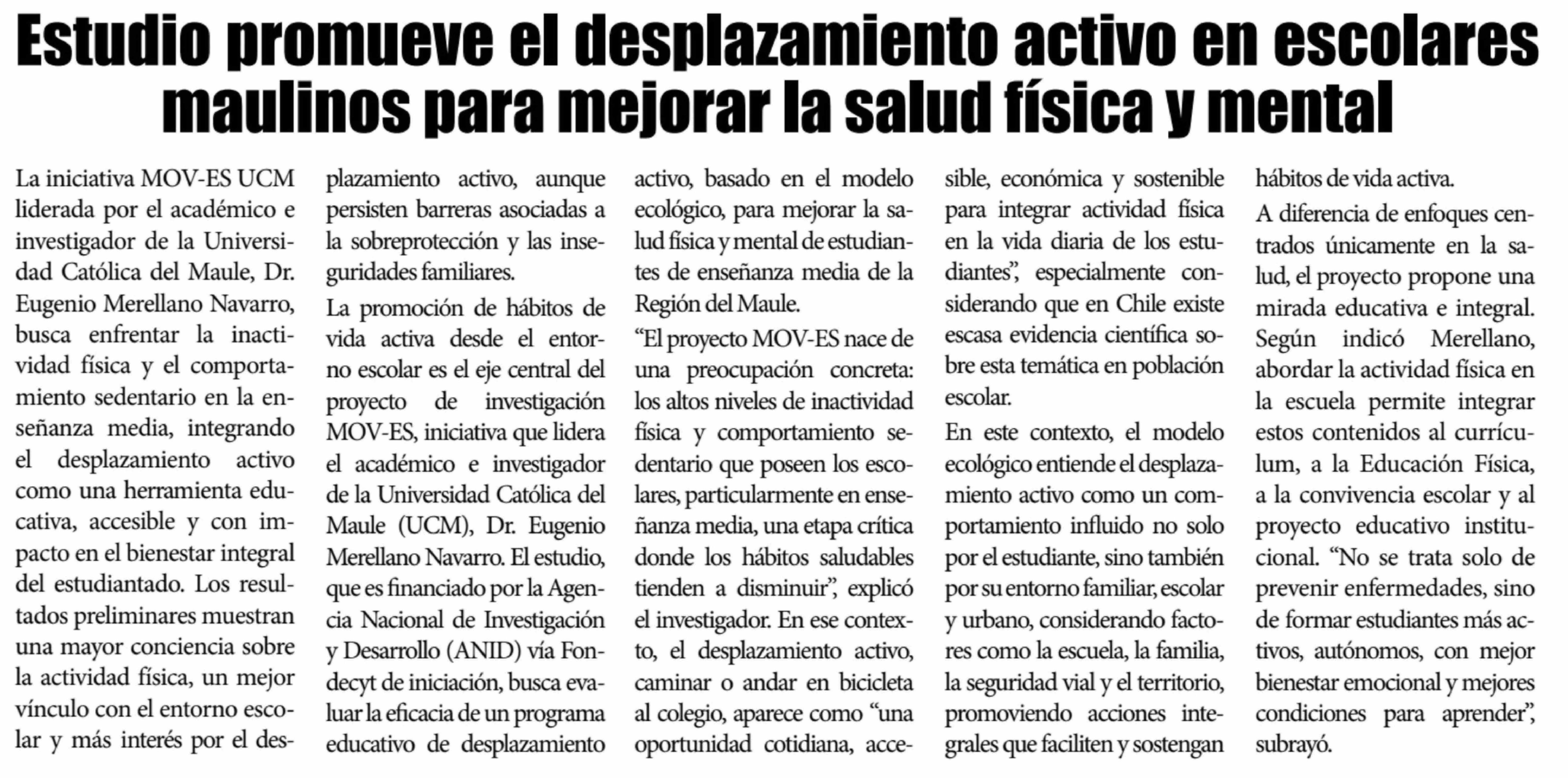 | Título: | Estudio promueve el desplazamiento activo en escolares maulinos para mejorar la salud física y mental |