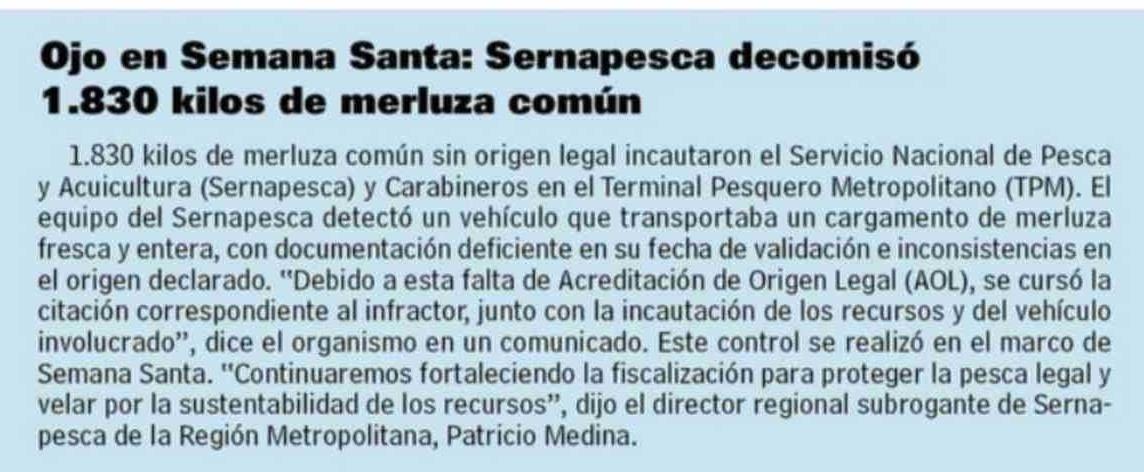 Título: Ojo en Semana Santa: Sernapesca decomisó 1.830 kilos de merluza común 1.830 kilos de merluza común sin origen legal incautaron el Servicio Nacional de Pesca y Acuicultura (Sernapesca) y Carabineros en el Terminal Pesquero Metropolitano (TPM). El equipo del Sernapesca detectó un vehículo que transpor