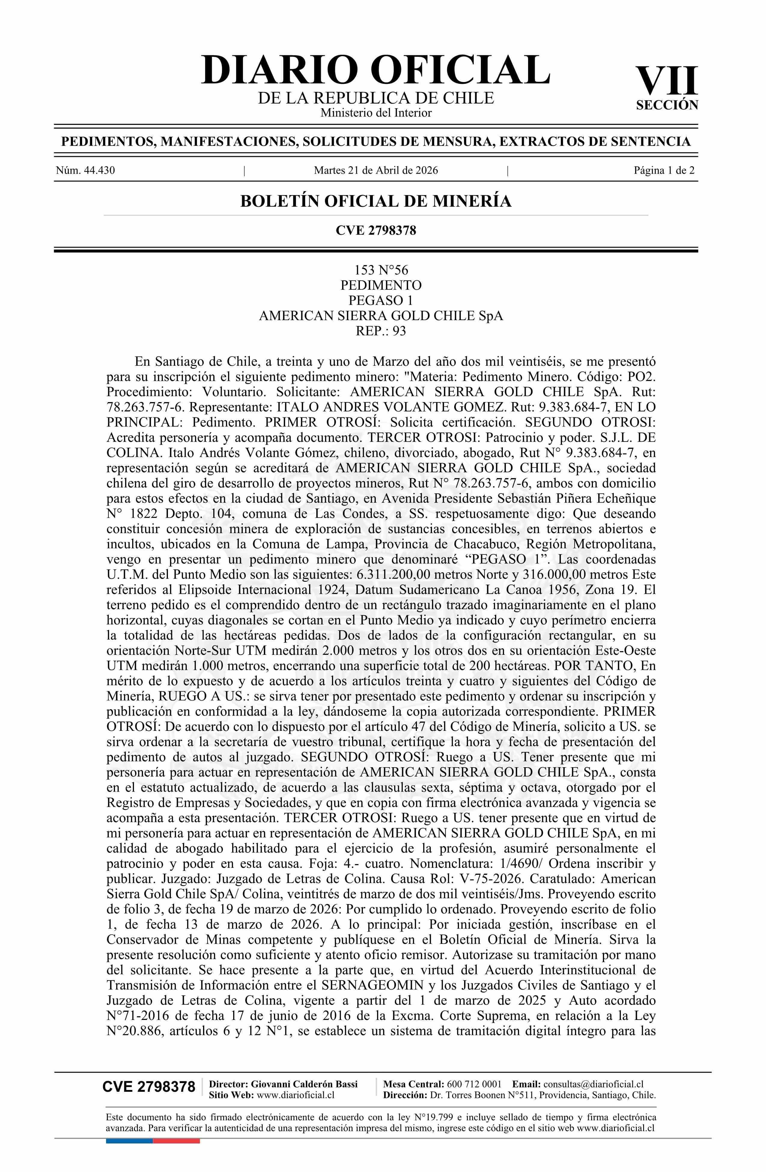 PEGASO 1 / American Sierra Gold Chile SpA 21-04-2026 DIARIO OFICIAL CHILE - BOLETÍN OFICIAL DE MINERÍA |