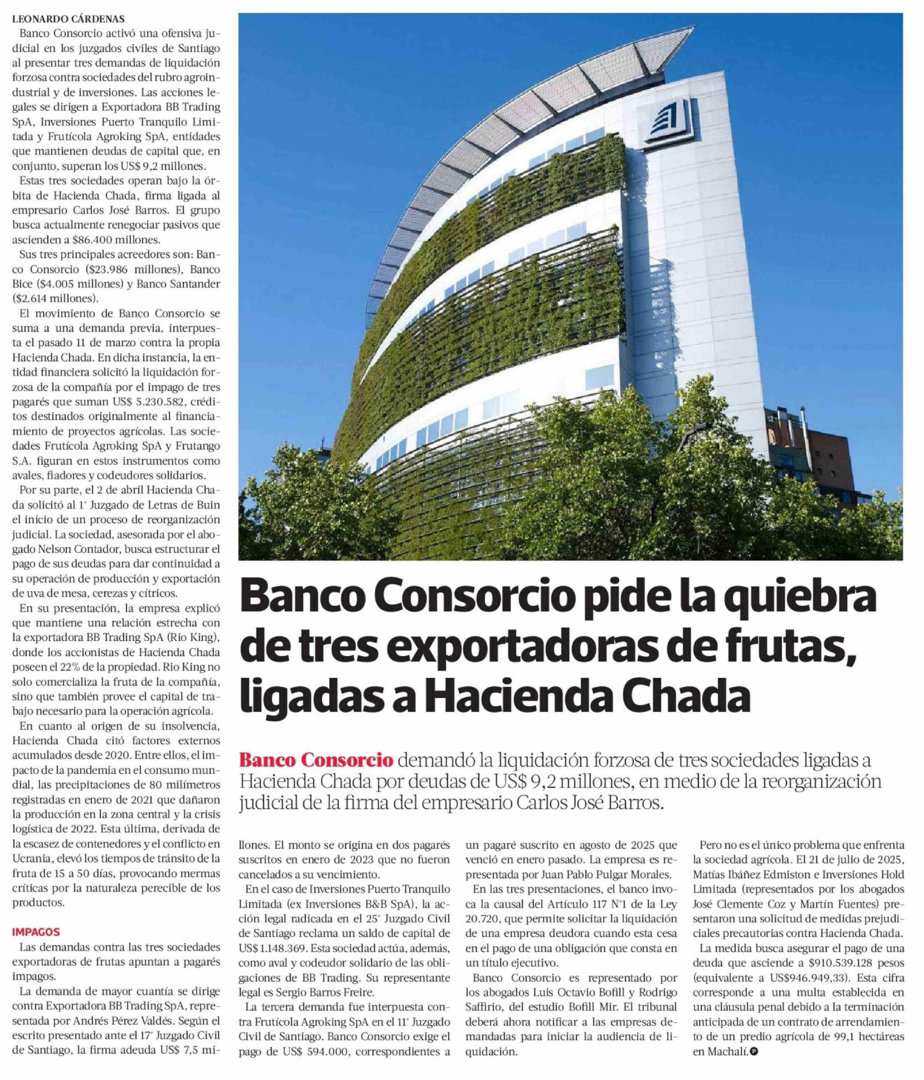 Banco Consorcio pide la quiebra de tres exportadoras de frutas, ligadas a Hacienda Chada 17-04-2026 La Tercera |