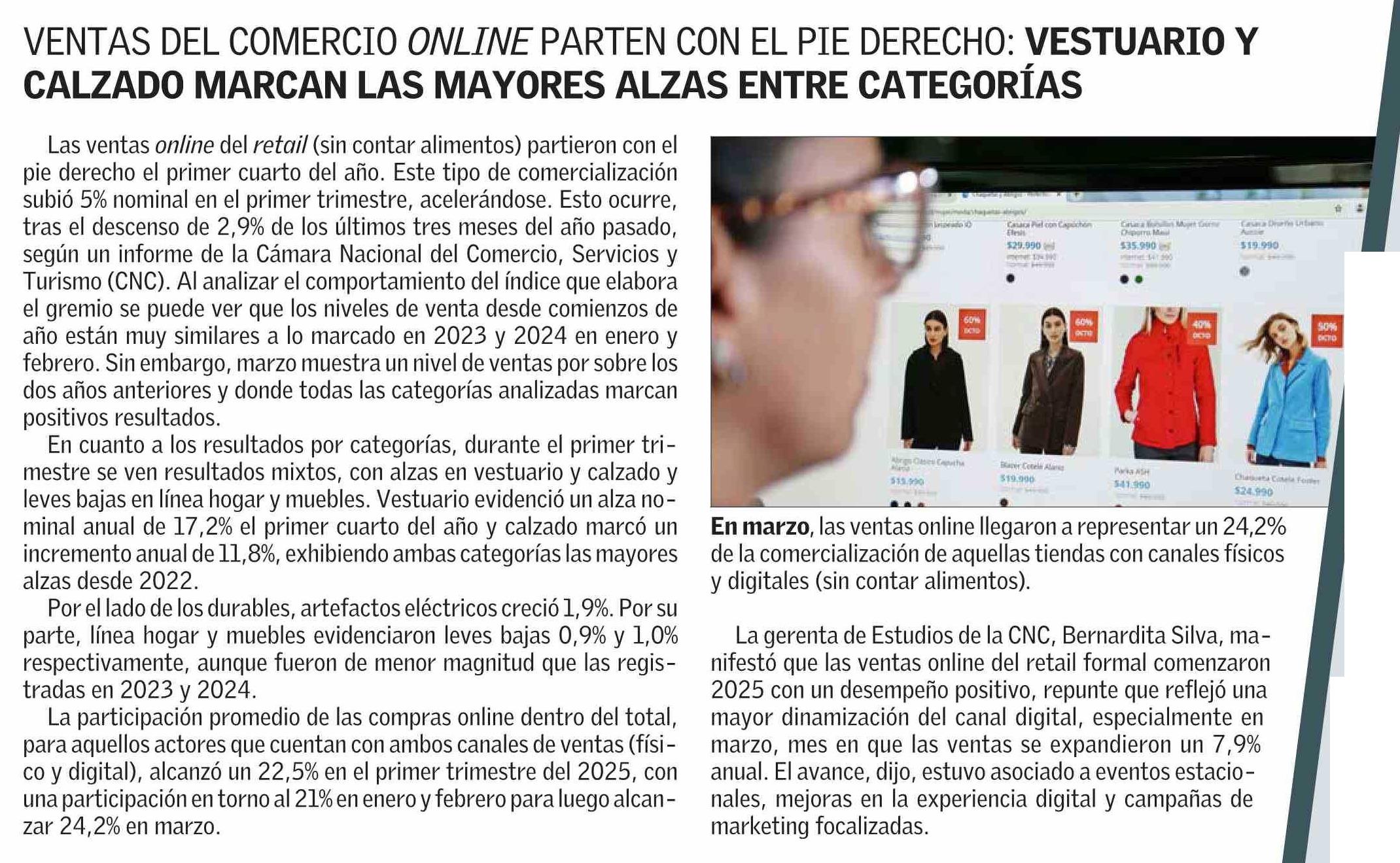 VENTAS DEL COMERCIO ONLINE PARTEN CON EL PIE DERECHO: VESTUARIO Y CALZADO MARCAN LAS MAYORES ALZAS ENTRE CATEGORÍAS 11-06-2025 El Mercurio |