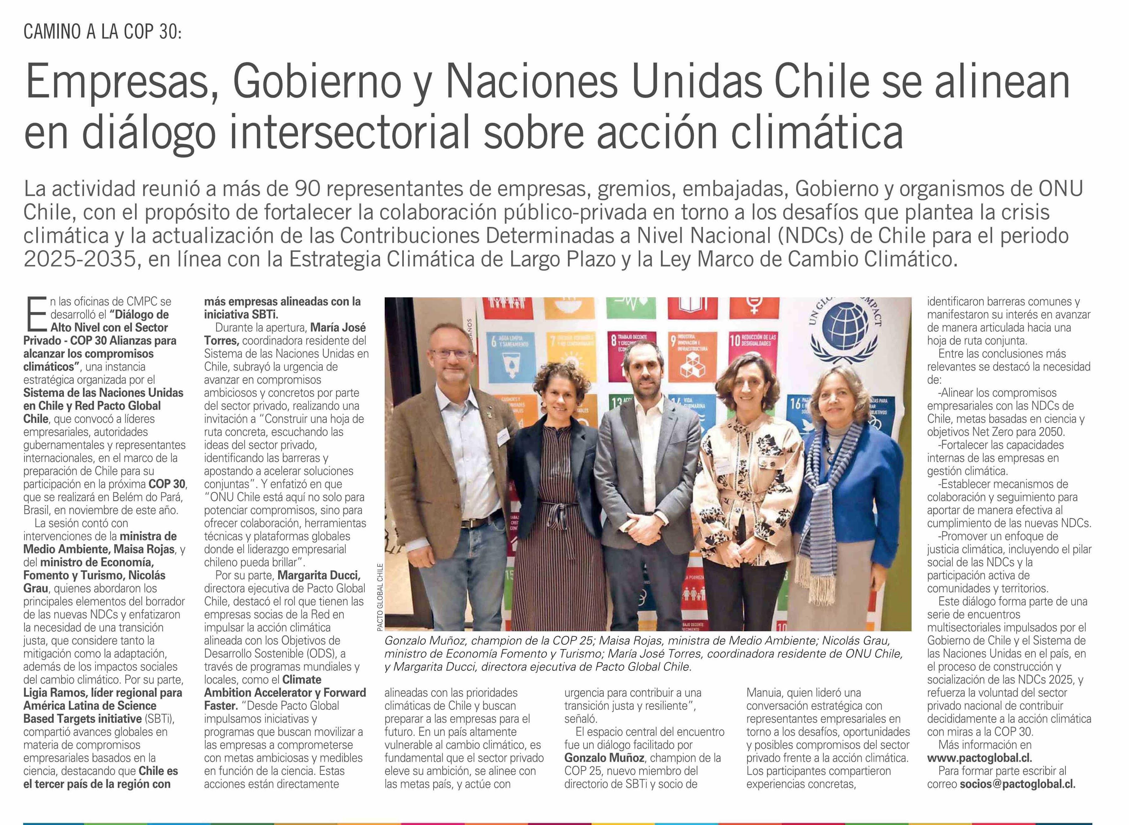 Empresas, Gobierno y Naciones Unidas Chile se alinean en diálogo intersectorial sobre acción climática 22-05-2025 El Mercurio |