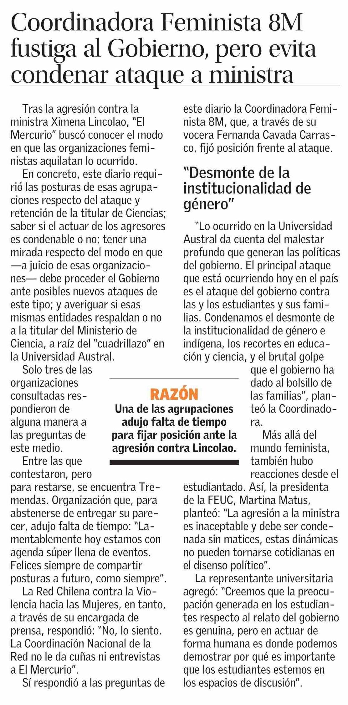 Coordinadora Feminista 8M fustiga al Gobierno, pero evita condenar ataque a ministra 10-04-2026 El Mercurio |